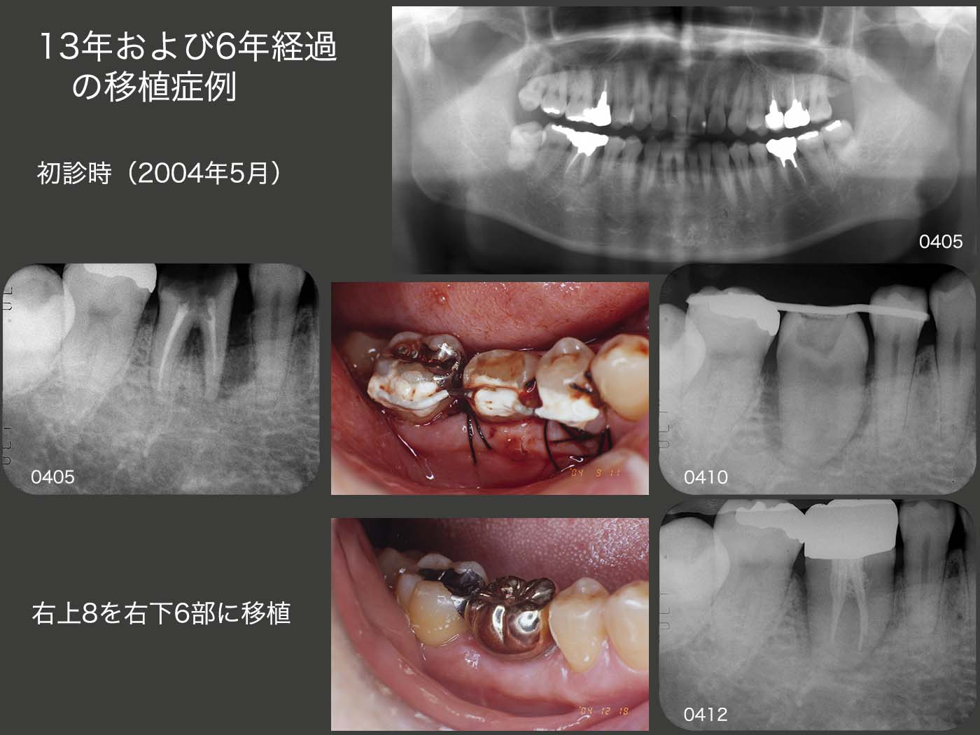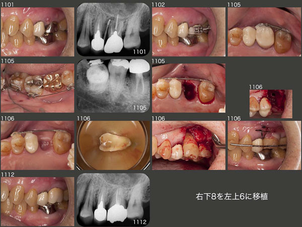 2004年5月初診,54歳男性.主訴は右下6が腫れて痛い.近心根は歯根破折しており保存不可能であるが,遠心根は保存できる.しかしこの時は,右上8に歯根形態の良いドナー歯があることから,遠心根も抜去し,移植を選択した(04年9月).12月にクラウンを装着した.