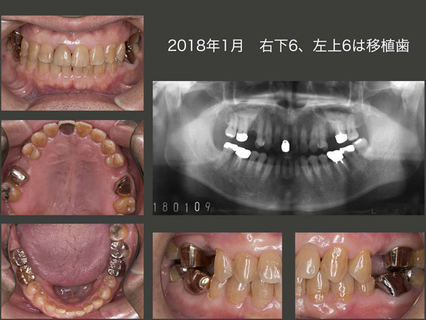 2018年1月の状態.右下6は移植後13年,左上6は移植後6年経過している.特に左上6は,移植時頰側に全く歯槽骨がなかったので大変心配したが,今のところ順調に経過している.本当に,歯根膜の凄さに今更ながら驚かされる.