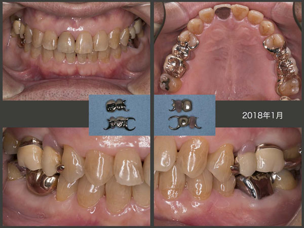 2018年1月,可撤式ブリッジ装着時の状態.04年5月の初診時から合計4本歯根破折を起こしている.当然すべて無髄歯であることから,やはり抜髄しないことが大切である.当然,移植歯も無髄歯であるから決して安心はできない.しかし,患者さんは今年定年を迎え,仕事中のTCHも減ることから,この先は安定するのではないかと期待している.