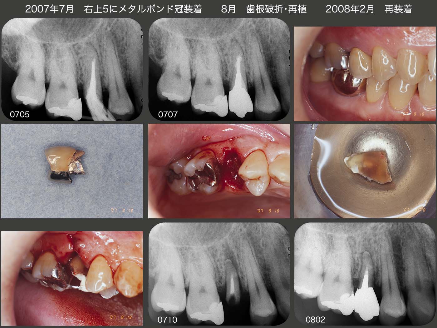 2007年4月,右上5がコアごと脱離した.念のため感染根管処置を行ったが,根尖まで穿通することはできなかった.7月にメタルボンド冠を装着した.しかし,何と8月に歯根破折してしまった.ここで本来は矯正的挺出を行うが,根尖に不安があったのでこの時は再植を選択した.実際,根尖付近に私が開けてしまったのか人工的穿孔が認められた.08年2月,再度メタルボンド冠を装着した.