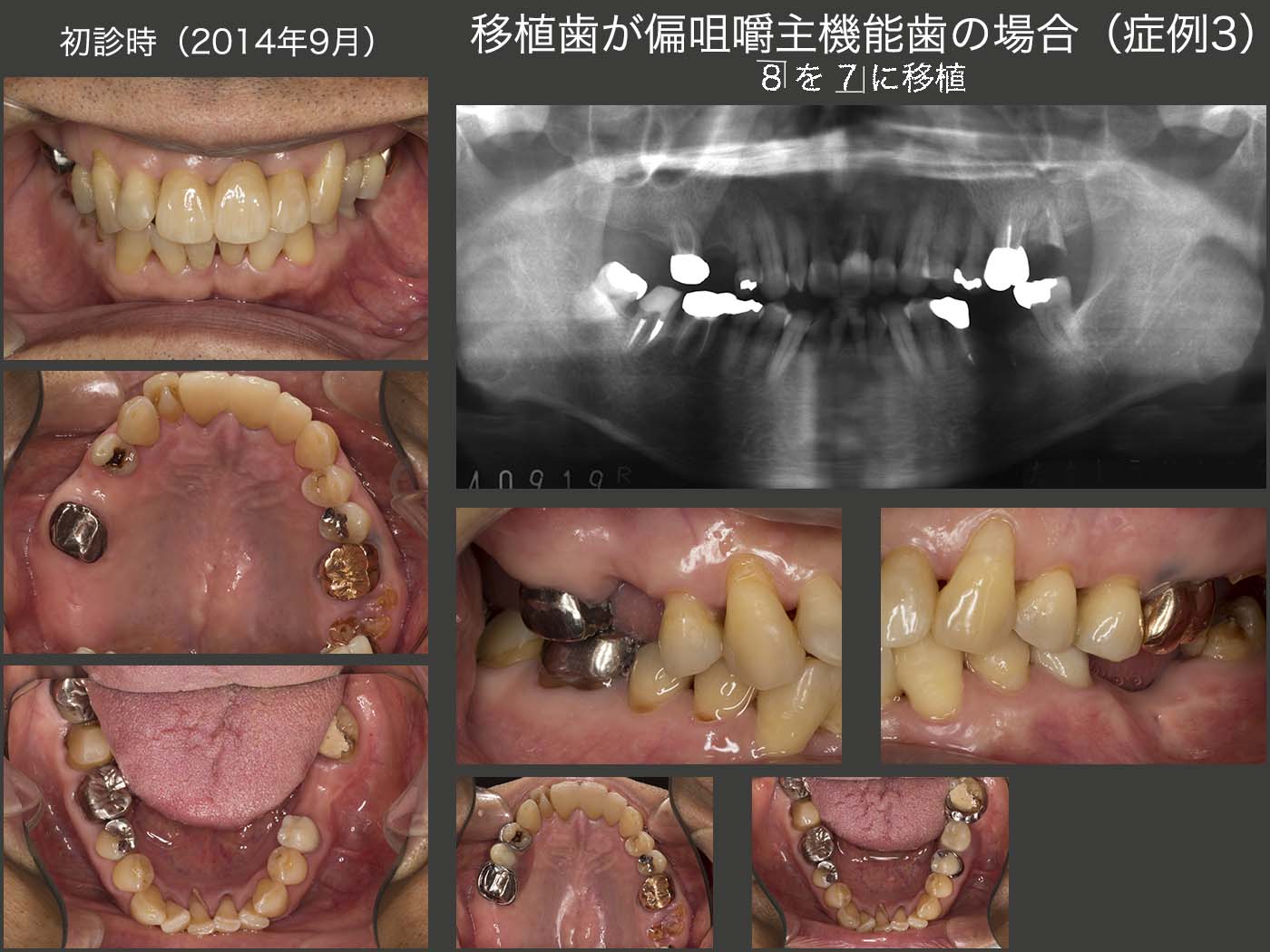 以上3症例,移植歯が偏咀嚼主機能歯(咀嚼の中心)となった症例の顛末を述べた.移植歯単独(症例2)でなく,連結固定(2次固定)された場合(症例1,3)でも予後が悪かったことに対し,かなりショックを受けた.確かに移植歯でなくとも咬合力が強い人の偏咀嚼主機能歯は,歯周病が増悪し,あるいは無髄歯であれば歯根破折が生じ易い.ましてや,受圧・加圧要素の改変のために移植術を施す際に,移植歯が偏咀嚼主機能歯となる場合は,連結固定したとしても予後が悪くなる可能性が高いと言わざるを得ない.