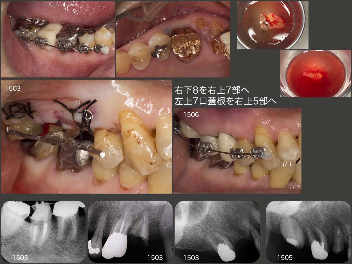 最終的には右側の咬合支持を増すために,右下8を右上7部に,左上7の口蓋根を右上5部へ移植することにした.なお右下8に挻出力を加え,歯根膜を傷つけずに抜歯しやすいように工夫した.2015年3月に移植を行った.なお,移植された右上7が咬合平面より大分低位に位置してしまったため,6月5日に矯正的挻出を施し,7月22日に終了した.