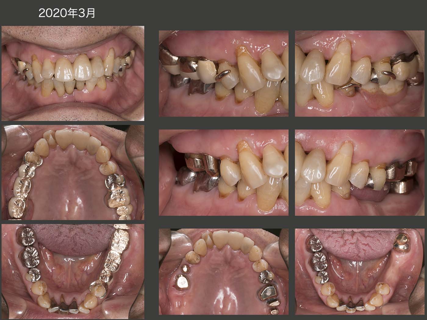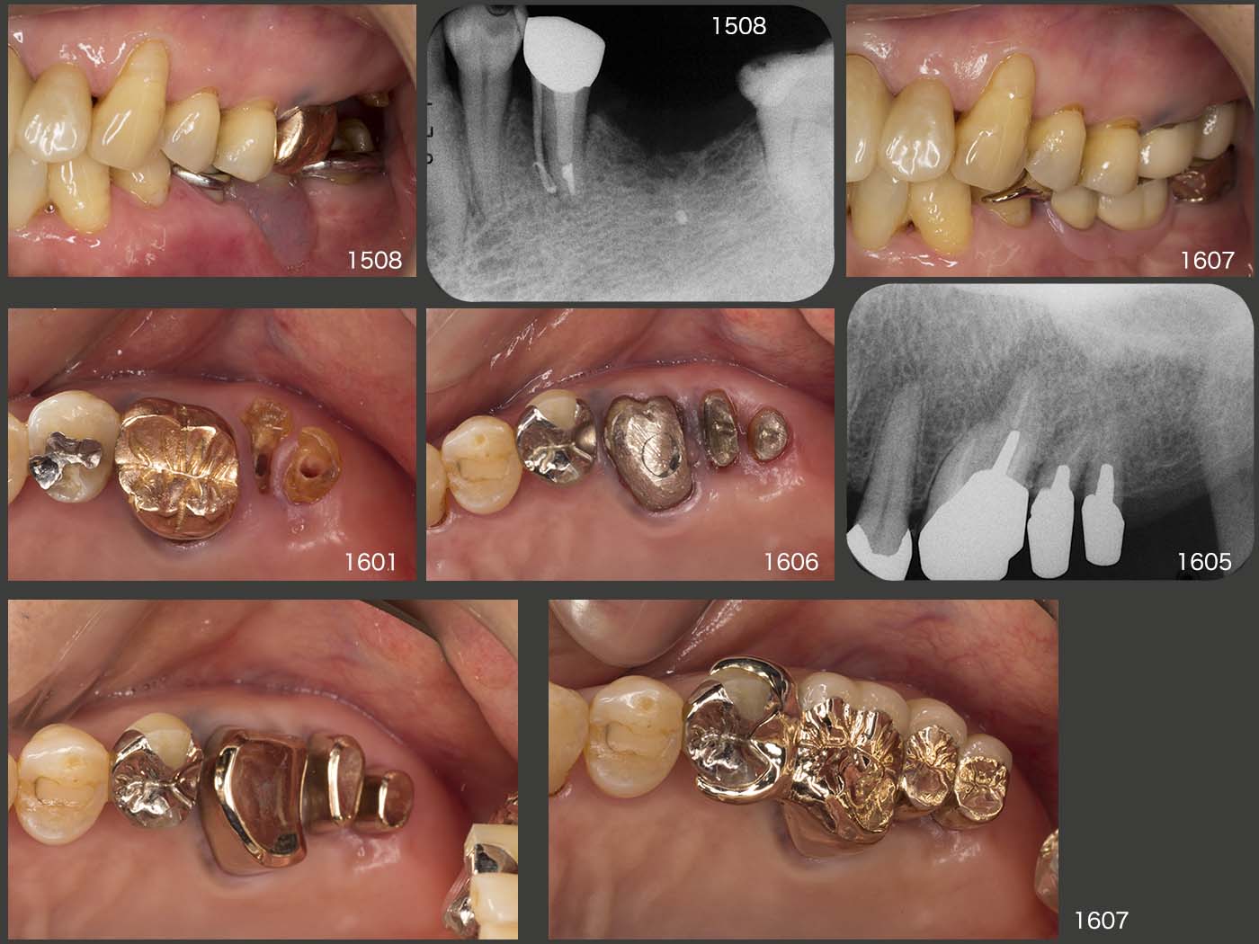 移植の術前,術後と患者さんは左側咬みを余儀なくされたため,2015年8月,左側の咬合支持歯である,左下5に歯根破折が生じてしまった.そこで左下7にコーヌス冠,健全歯である左下4にはクラスプを用いた義歯を製作した.