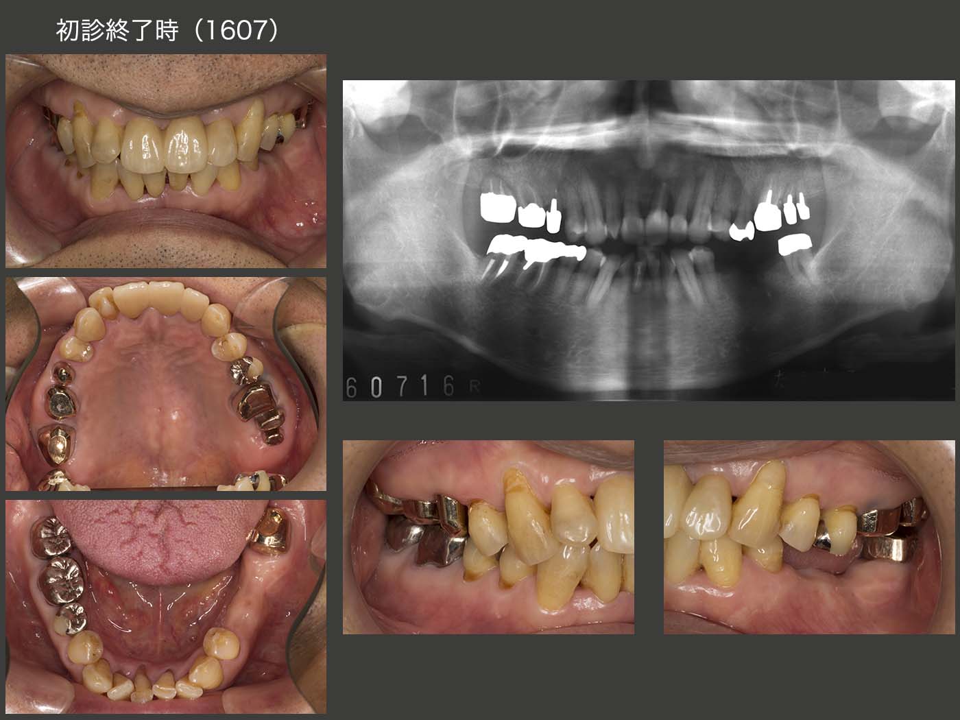 2016年7月,初診終了時の状態.右上7(移植歯)の歯周ポケットは最大5mmの値を示した.左上1は初診時より最大9mmの歯周ポケットがみられたが,歯周基本治療以外,特に治療を施していない.その他の残存歯に問題はみられなかった.なお,初診終了時の残存歯の分布から右側が習慣性咀嚼側になることが予想できる.