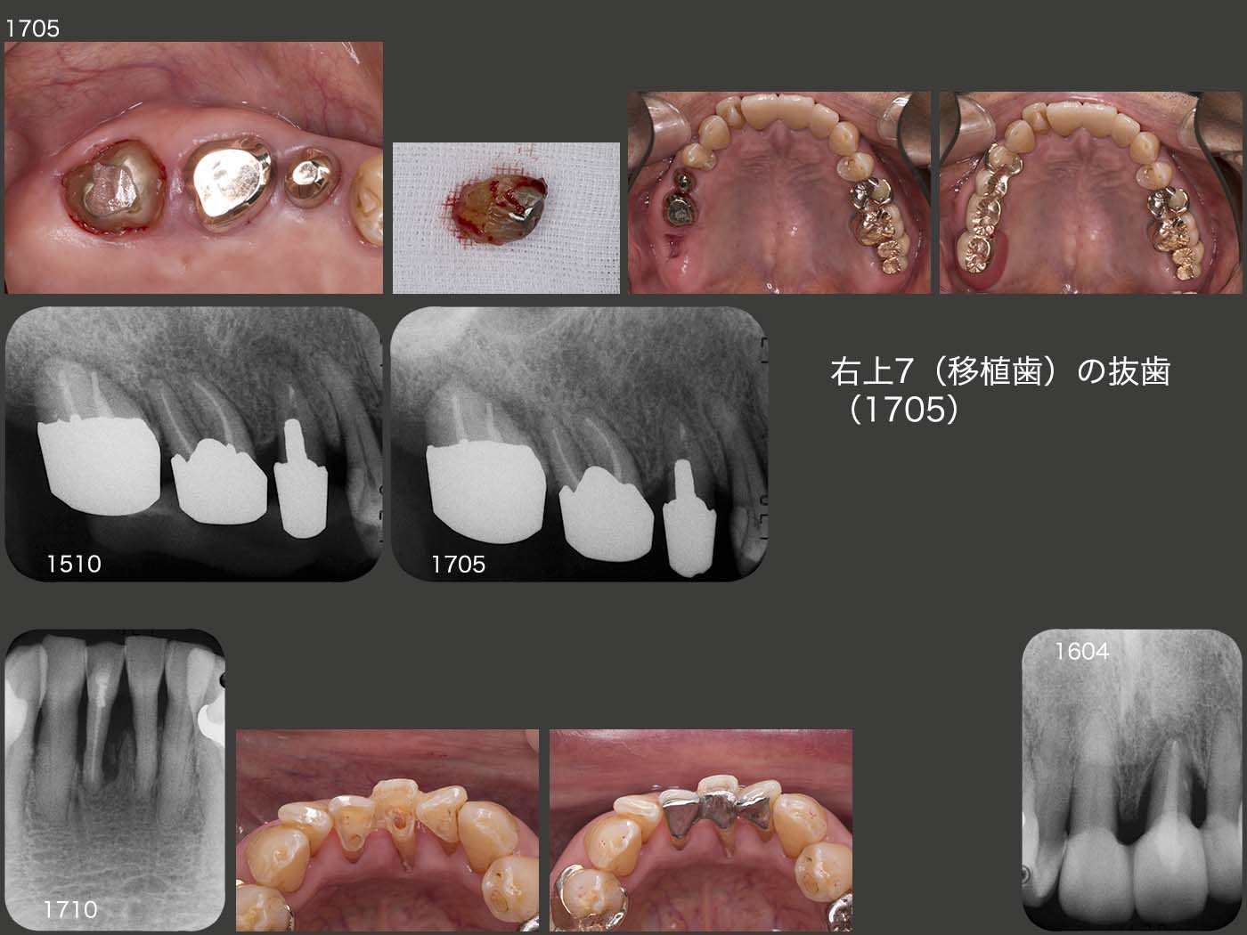 反対に,「歯の移植 5.移植することで片側処理の可撤式ブリッジで対応」のケースのように移植された左上7の歯が咀嚼の中心とならない場合,予後が良い。(しかし,この症例では咀嚼側である右側の歯にその後トラブルが続発している.)