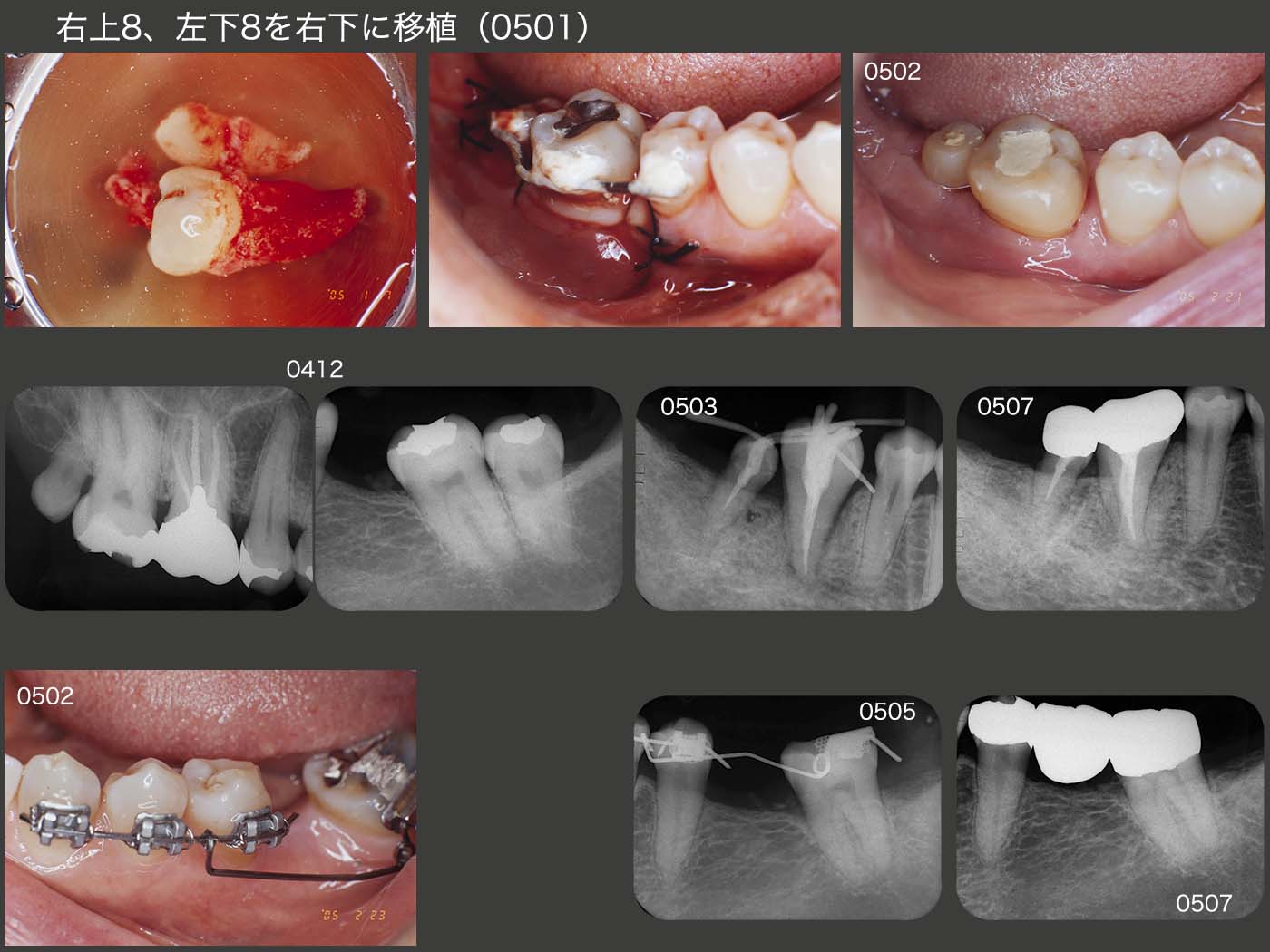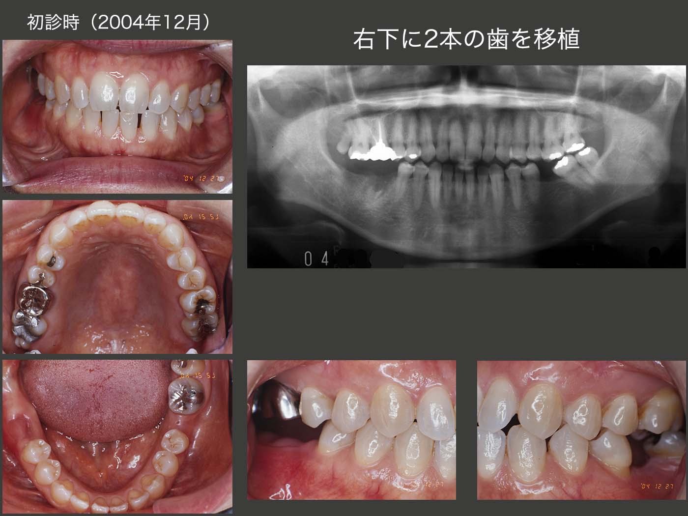 2004年12月初診,52歳の女性.主訴は,1ヵ月半前に右下を他院で抜歯したが,まだ痛みがあり,またあとの治療をどうしたらよいか悩んでいるとのこと.以前左下6を抜去後,放置したために左下7が近心傾斜していることから,左下8をドナー歯として右下に移植し,左下7をアップライトすれば,全体のバランスがとれることを説明し,同意を得た.また右上8も非機能歯であることから,この歯も一緒に移植することにした.