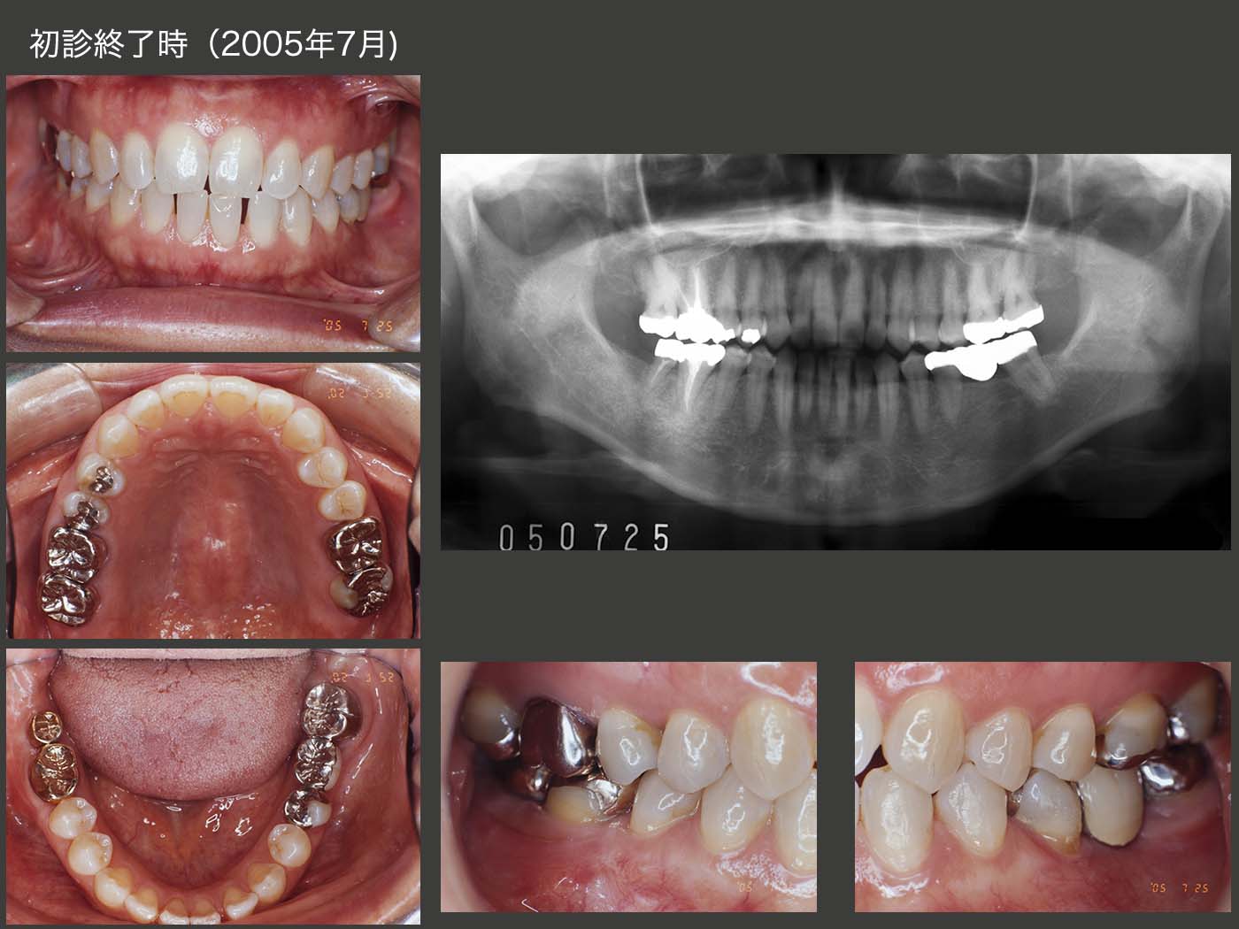 2005年7月,初診終了時の状態.移植した右下6および7は,今なら連結固定するところであるが,当時は暫間被覆冠にて暫く経過を観察して,特に問題がみられなかったため,それぞれを単独冠とした.左下のブリッジについても,保持力の増大のためには左下5の頰側歯質を削去し,フルクラウンにするべきであろう.しかし,保険給付の範囲内となると,理解していても頰側の削去をためらってしまう.実際,ブリッジが将来外れないように頰側を削去するか,あるいは審美性のために残すかを患者さんに選んでもらうと,後者を選択する人が多い.