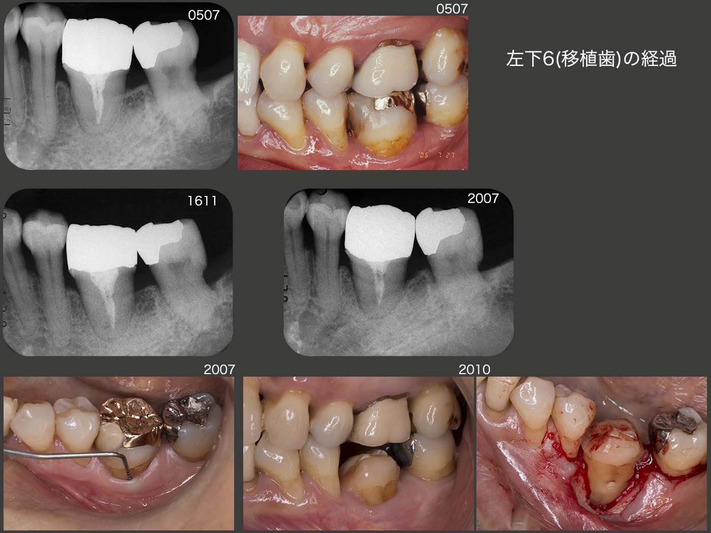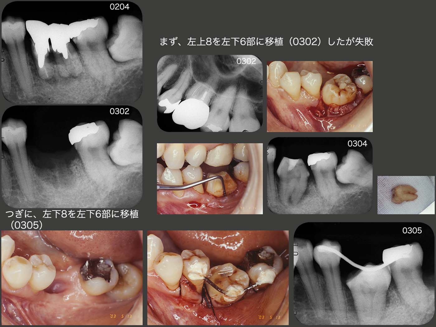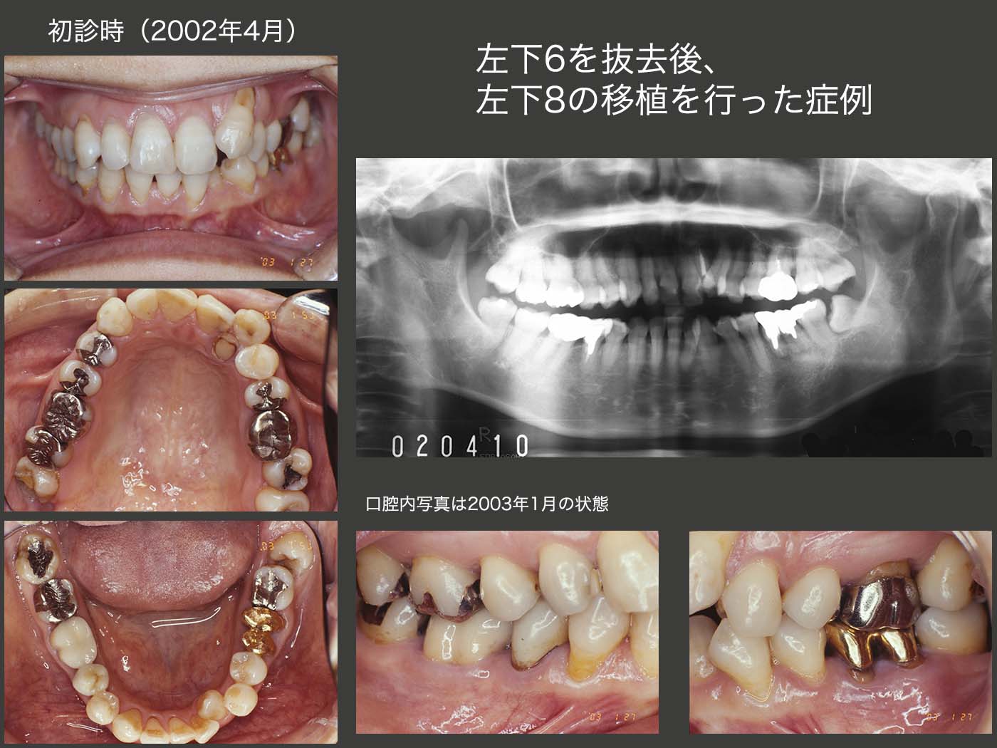 2002年4月初診,41歳女性.主訴は,ムシ歯を治したいと,左下6が浮くような感じがするとのこと.歯周基本治療後,まず左側の治療を行った.スライドは03年1月,いよいよ左下6の治療にとりかかろうとした時の状態.ここで,左下6は歯周ポケットが最大6mmであり,このまま暫く経過をみる選択肢もあると思うが,今回は患者さんの希望もあり,治療を積極的に行うことにした.治療方針は,メタルコアを外して根管治療を行うより,左側の上下どちらかの智歯を移植するほうが将来的にも良いと判断した.