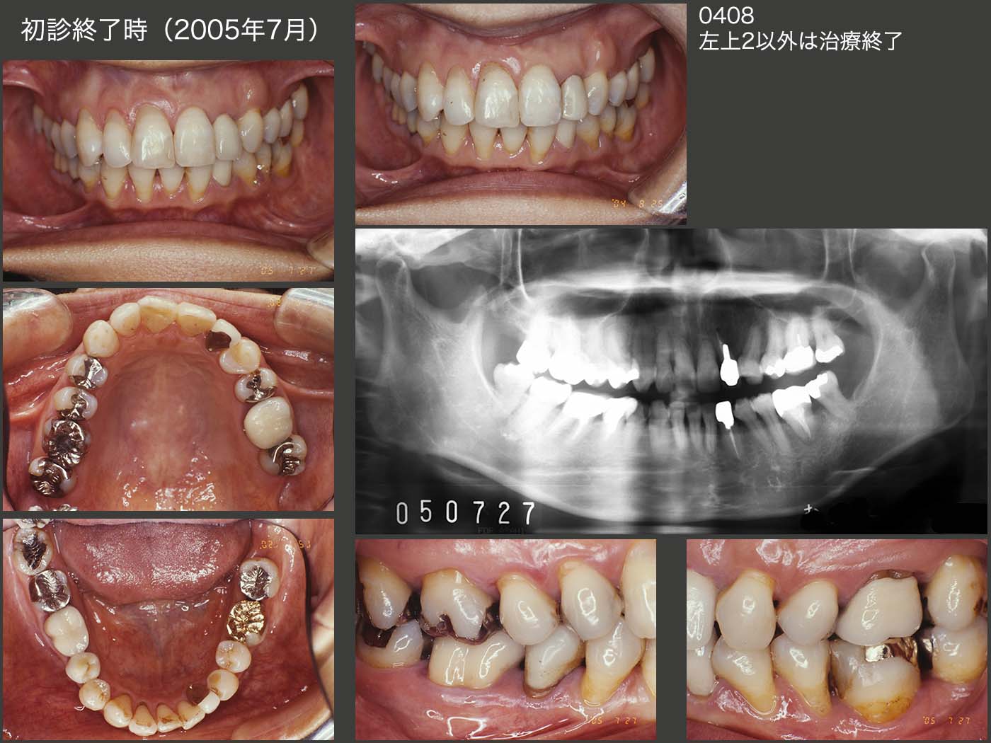 ここで,まったく恥ずかしい話であるが,左上3に犠牲になってもらい,歯科矯正まで行った左上2について,コア形成時に何と歯根を穿孔してしまった.(今なら根管内にペリオドンを貼付し,次回来院時になるべく無菌状態を維持し,止血状態を確認する.そのうえで滅菌されたダッペングラスと筆を用いたスーパーボンドにて穿孔個所を封鎖し,コアの印象採得を行っている.)当時の記録がなく,どのように処置したかの詳細は不明であるが,2004年8月,左上2には暫間被覆冠を装着し,ここ以外の治療はすべて終了した.左上2の穿孔封鎖後,約1年間経過を観察し,特に問題がみられなかったので左上2にメタルボンド冠を装着した.05年7月,すべての治療が終了した.