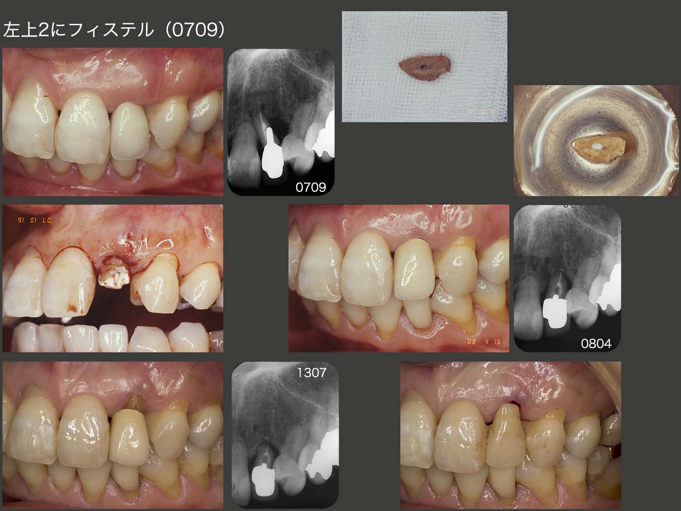 2007年9月のリコール時,左上2にフィステルが生じていた.穿孔部が原因であることは明らかなため,10月に抜歯し,穿孔部をスーパーボンドにて確実に封鎖し,再植した.暫く経過をみて,08年4月に再度メタルボンド冠を装着した.