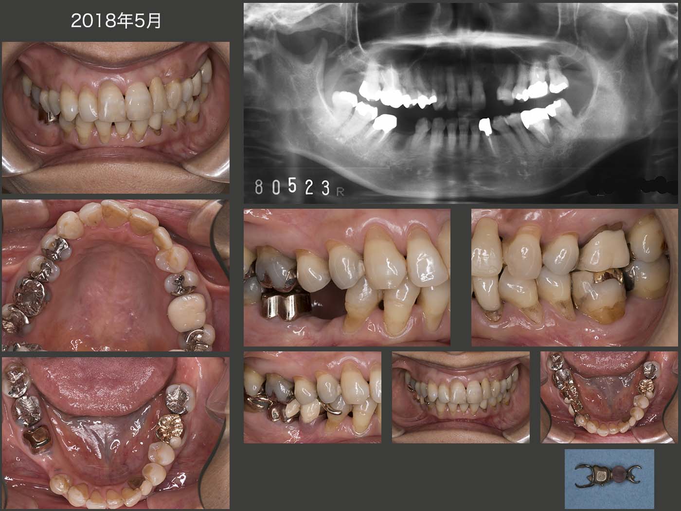 2018年5月の状態.右下にはコーヌス義歯を装着した.右下7のクラスプは,無髄歯である右下6に加わる水平力を少しでも担うことと,将来右下6が歯根破折等で失った場合,この部分に義歯床を足すのみで,そのまま使用できることを考えて付与した.