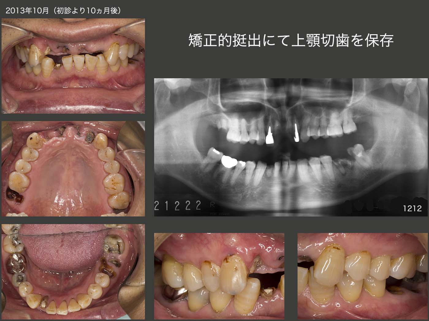 2012年12月初診,60歳の男性.上顎中切歯の保存を希望しての来院であったが,さすがに保存不可能と判断した.その後来院が途絶えたが,13年10月に,上顎両側側切歯も脱落し,何とか治療して欲しいとのことで再来院した.兎に角,抜歯をして欲しくないとの強い希望があったので,保存が難しいと思われる上顎2〜2,右下2および右上7をとりあえず保存してみることにした.もちろん確約はできない旨をお伝えした.なお,左下6は抜歯ということで,ご理解して貰った.