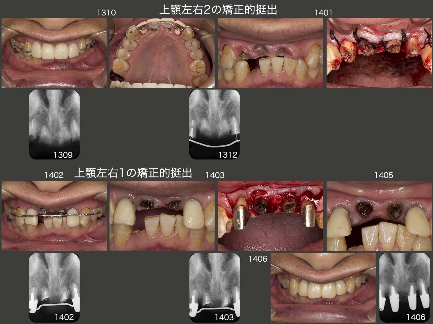 2013年10月25日に,まず上顎左右側切歯の矯正的挻出を開始し,12月20日に終了した.14年1月22日に上顎2〜2の歯冠長延長術を行った.ここで,両側側切歯にコアを植立し,暫間被覆冠が外れにくくした.また,両側中切歯にもピッグテールが掛けられるようになったので,2月24日から中切歯の矯正的挻出を開始し,3月17日に終了した.3月29日に両側中切歯の歯冠長延長術を再度行い,歯肉縁上歯質を確保した.患者さんは,2から2の単独植立を希望された.しかし,両側中切歯の動揺が大きかったので,同部は連結固定することにし,一方両側側切歯の動揺は僅かであったので,単独植立することにした.ただ,前歯は審美優先で,ここで物を食いちぎることはできないし,絶対にしてはいけないと,来院のたびに力説した.