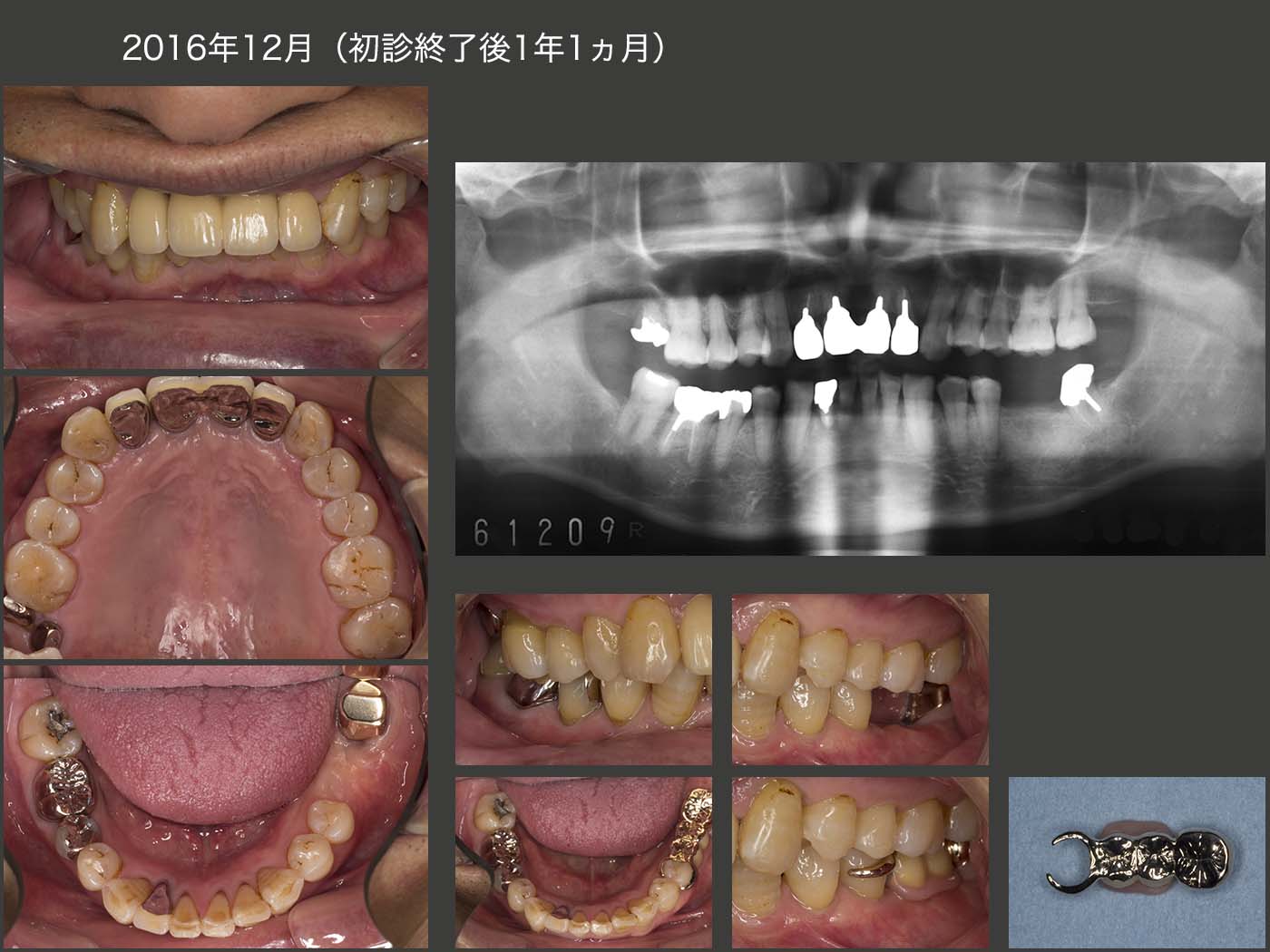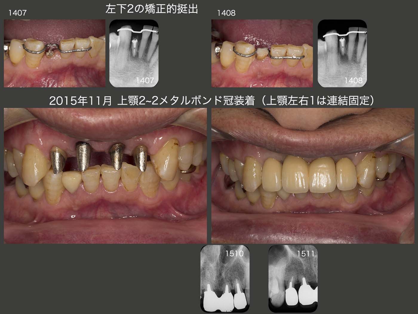 上顎2〜2は,2014年6月に両側中切歯にコアおよび暫間被覆冠装着し,1年5ヵ月間経過を観察した後の15年11月にメタルボンド冠を装着し,ここで初診終了とした.なお,この期間中に他部位の治療(15年8月,左下の可撤式ブリッジ装着)も行っていた.