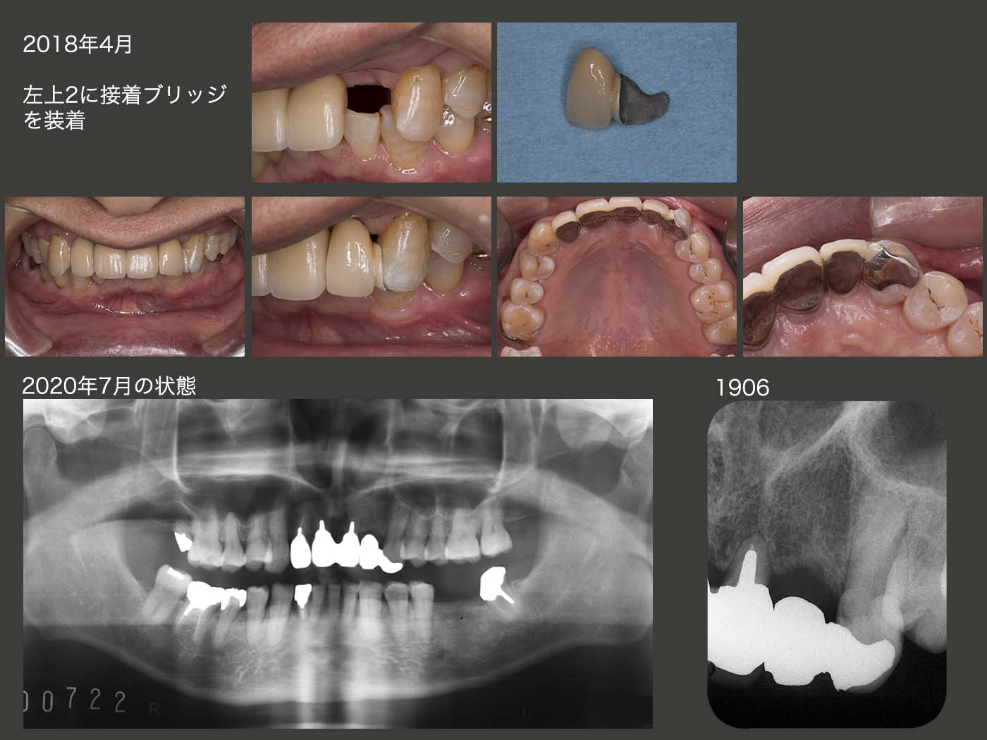 20年7月の時点で,接着ブリッジ装着後2年3ヵ月経過したが,19年10月に1回外れただけですんでいるので,まずまずと胸をなで下ろしている.