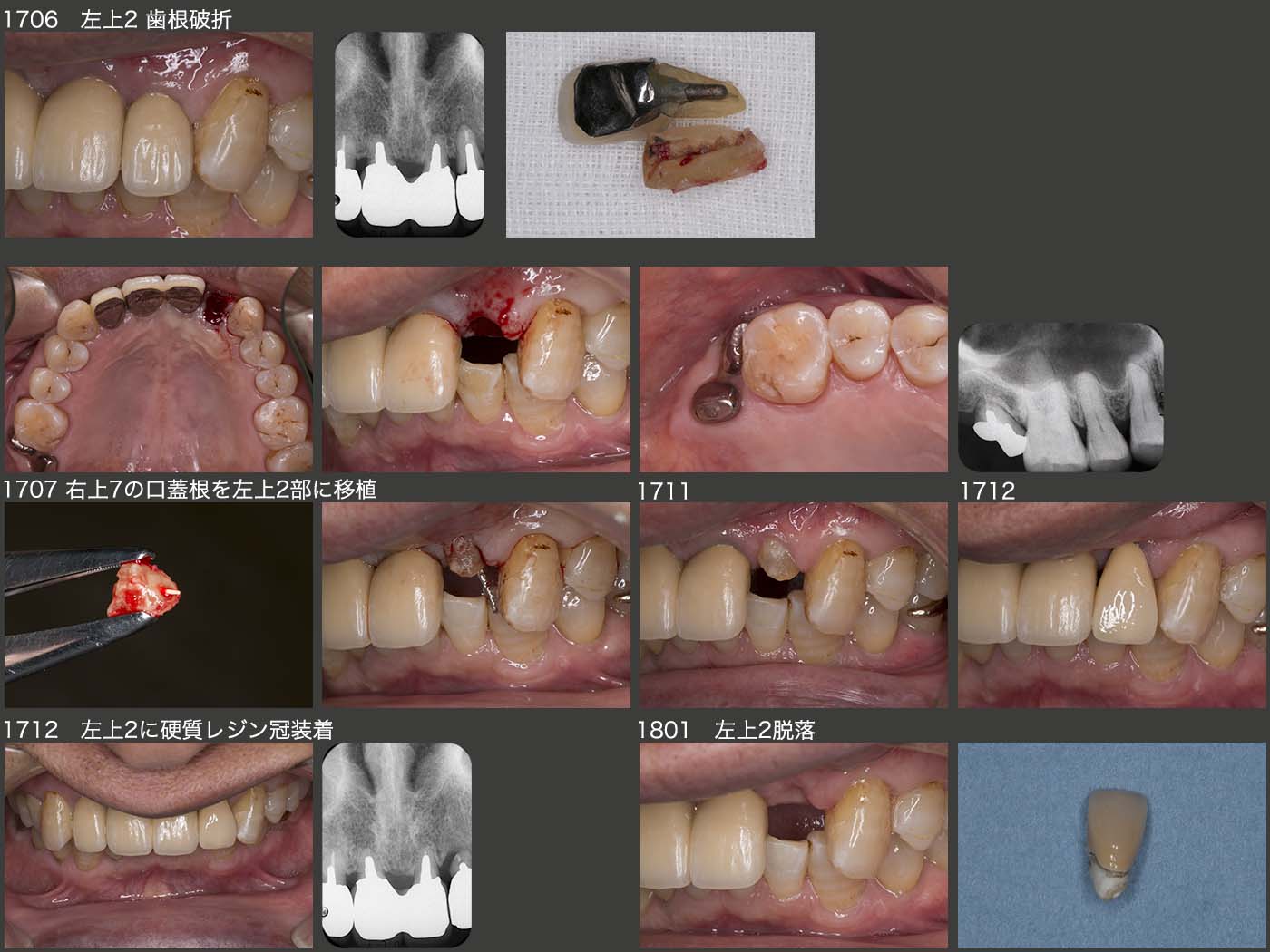 そこで目を付けたのが,とりあえず保存しておいた右上7の残根である.17年7月,口蓋根を抜歯し,左上2部に移植した.歯根は著しく短いが,移植後の動揺は思っていたより少なかったので,17年12月に硬質レジン前装冠を装着した.