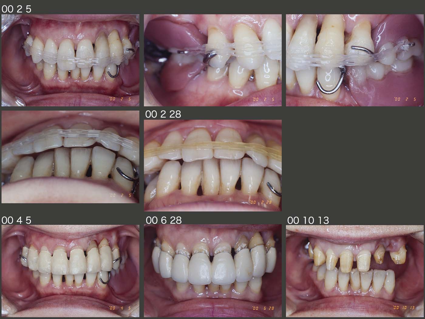 2000年2月,上顎前歯がフレアアウトしていたため,暫間義歯にゴムのかかるフックを付与し,患者さん自身にゴムの脱着をお願いして,上顎前歯が下顎前歯と咬合するまで継続して貰った.なお,期間は約3週間で済んだ.残存歯を有髄歯のまま保存したかったので,マージンの位置を高くして形成し,4月に連結固定した暫間被覆冠を装着した.その後,最終印象を行い,メタルボンド冠を試適した際,左上3が挻出してしまった.これは被覆冠を撤去する際に脱臼してしまった可能性が高い.6月,残念ながら左上3を抜去し,10月まで抜歯窩の治癒を待った.