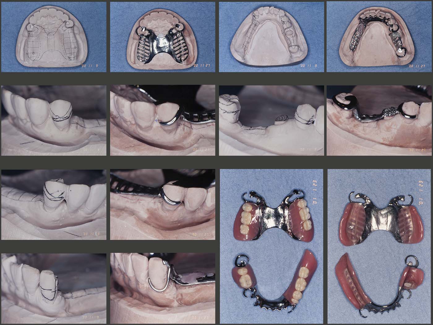 上下顎金属床の設計.母模型を複製し,耐火式模型を製作するが,この際歯科技工士さんに,もう一つ複模型を製作してもらっている.そして鋳造後,メタルを調整する際は,母模型には決して戻さず,複模型上で行って貰っている.口腔内で金属床を試適し,精度等問題がなかったら初めて母模型に戻している.この理由は,クラスプの鉤端等で母模型を傷つけたあと,口腔内に試適し,もしも問題が発覚した場合,また筋形成・最終印象・咬合採得・上顎の場合エクスターナル・フィニッシュラインを記入するために人工歯排列をやり直さねばならず,大変な労力の無駄に繋がるからである.何よりも,来院回数が増すことで,患者さんに迷惑を掛ける.