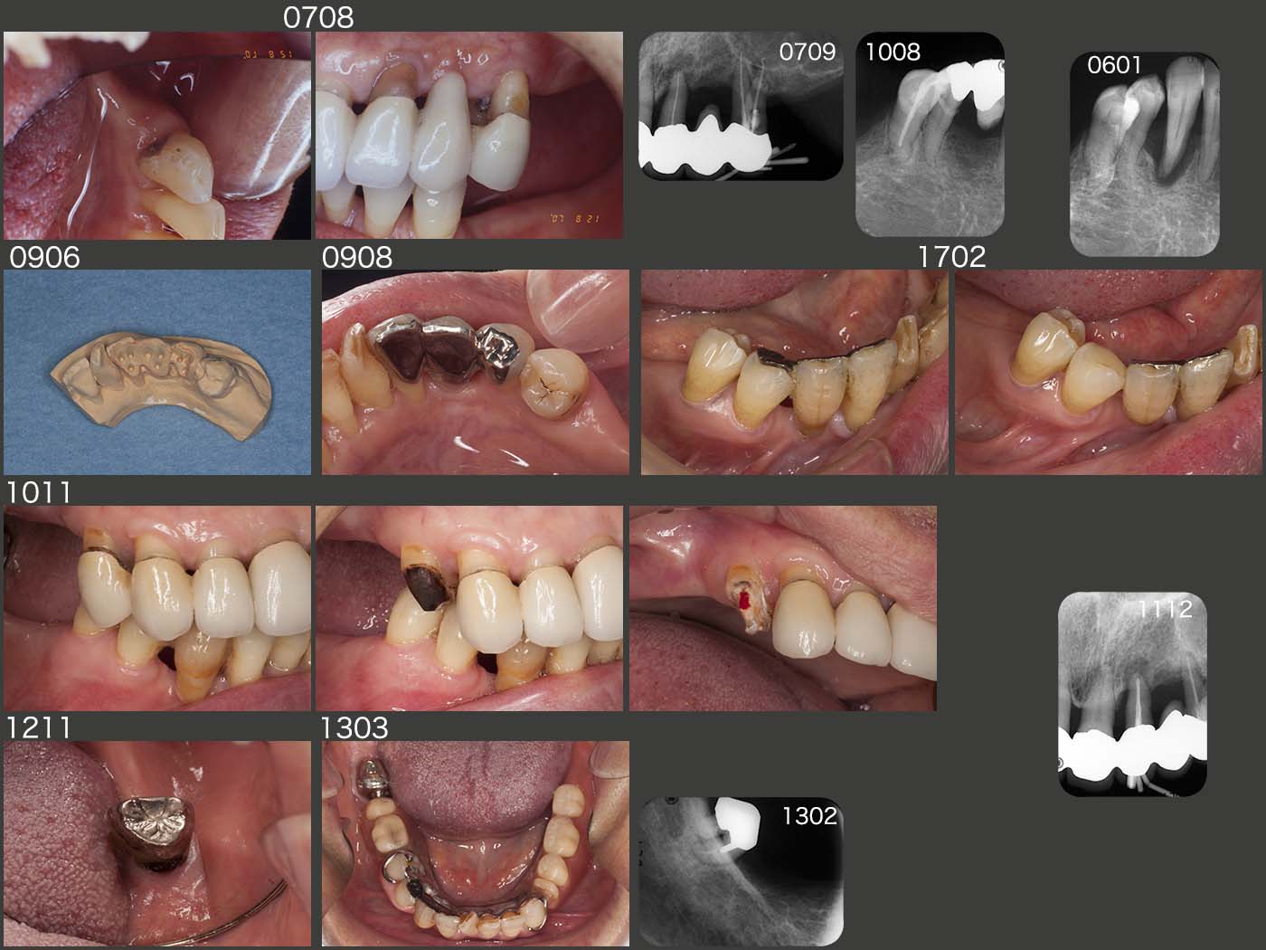 話は前後するが,06年1月,元々歯周病が進行していた右下3を抜去した.その後,歯冠部をスーパーボンドで隣在歯に固定していたが,時々外れるので,09年6月に,舌面板で連結固定した.しかし,17年2月,右下4の舌面板がセメントアウトしてしまった.右下3,4間で切断した状態で,20年11月まで何とか保っているが,延長ポンティック付きの右下2の動揺は著しく大きい.