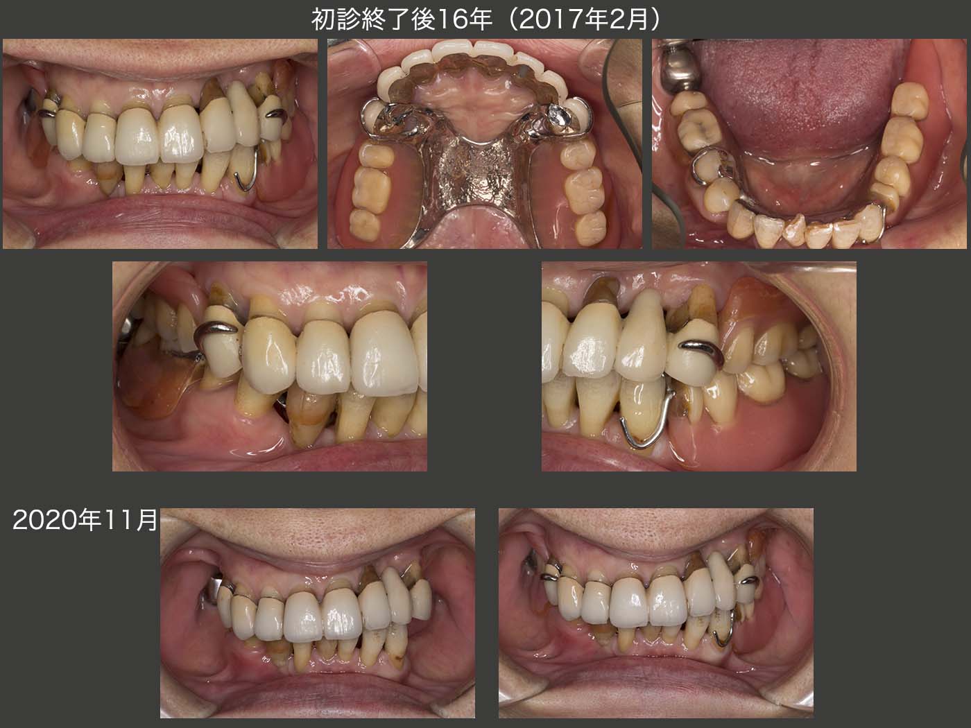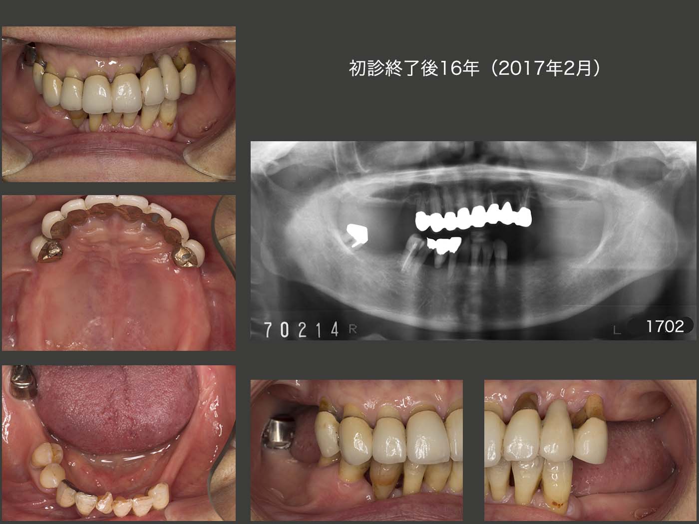 2017年2月,初診終了後16年の状態.スライド5で述べたマイナーチェンジを時々行ったが,全体としては良好に推移している.特に,メタルボンド冠で連結固定した上顎の残存歯が,まだ十分に機能していることに驚いている.
