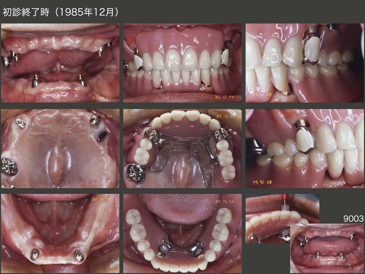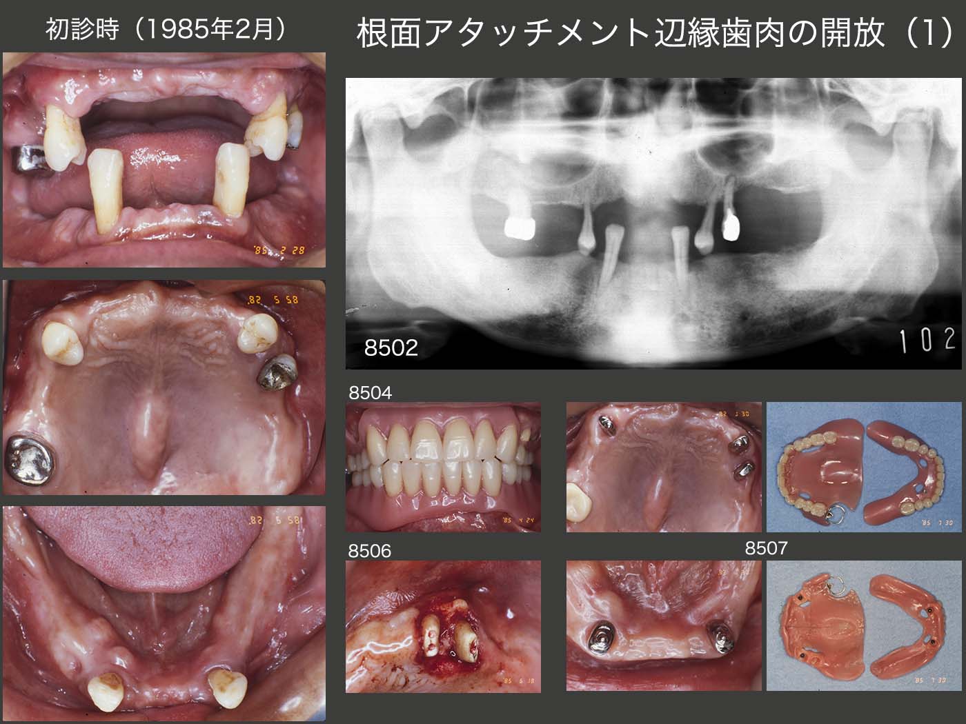 1985年12月,初診終了時の状態.根面アタッチメント辺縁歯肉の開放の一番の目的は,唾液による自浄作用により,根面カリエスが生じにくくなることへの期待である.さらに,歯周病の予防もできれば尚更結構なことである.もちろん,義歯を外しての歯磨きが最も大切であることは言うまでもないが,昼食後に歯磨きできる環境にない方は,爪楊枝を使う感覚で歯間ブラシを入れてみてはいかがですかと指導している.