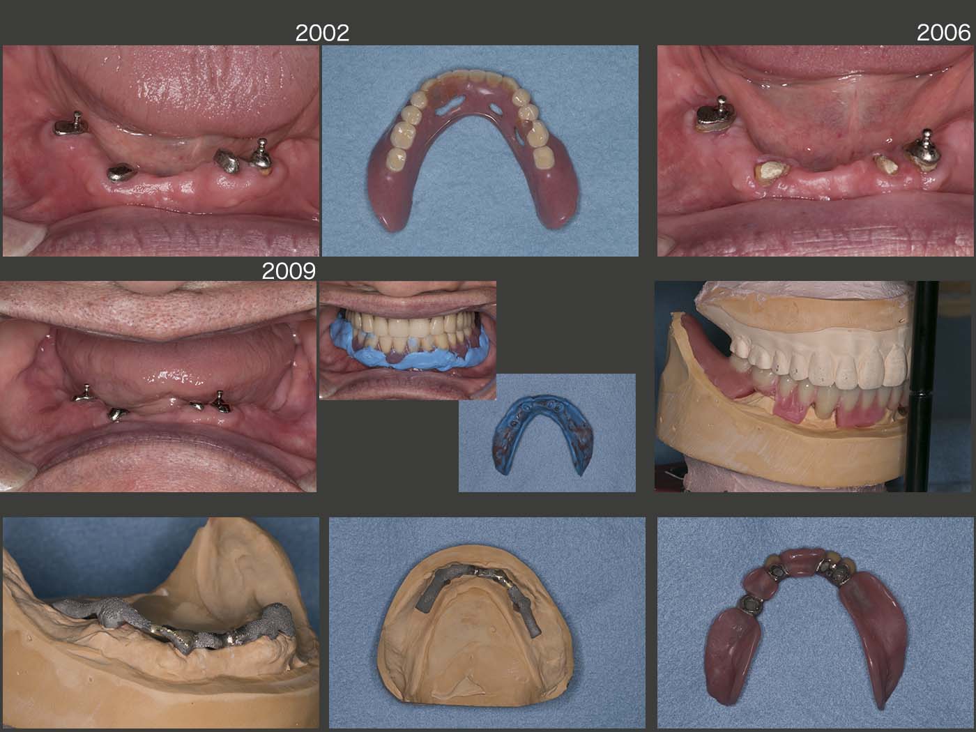 2016年11月初診,68歳男性.当院,代診の先生の症例.保存可能な左下3,右下5にOPAアタッチメントを,左下2,右下3に根面板を製作し,17年2月に上下顎に総義歯を装着した.この時の下顎義歯は,支台歯辺縁歯肉を義歯床で覆う形態であった.