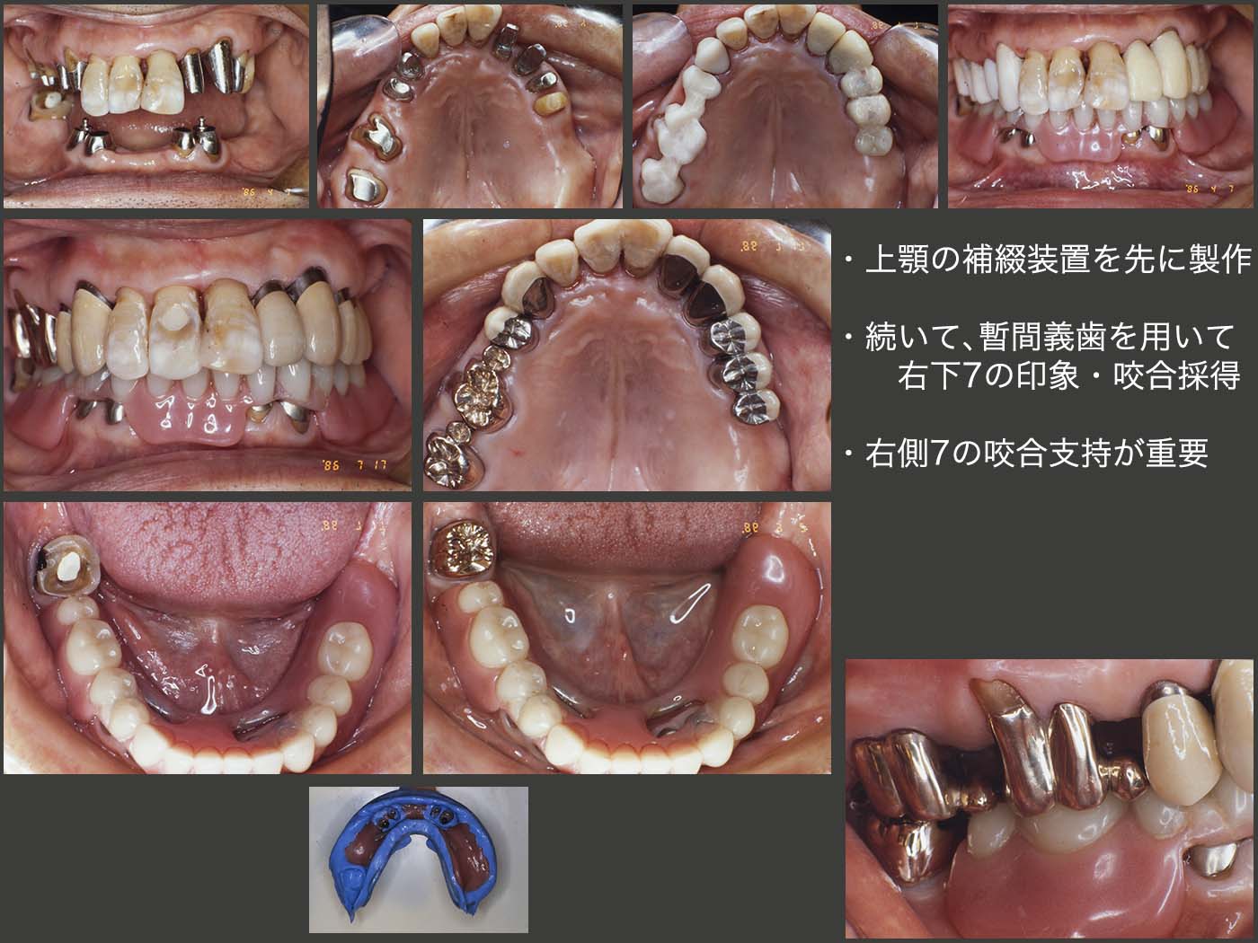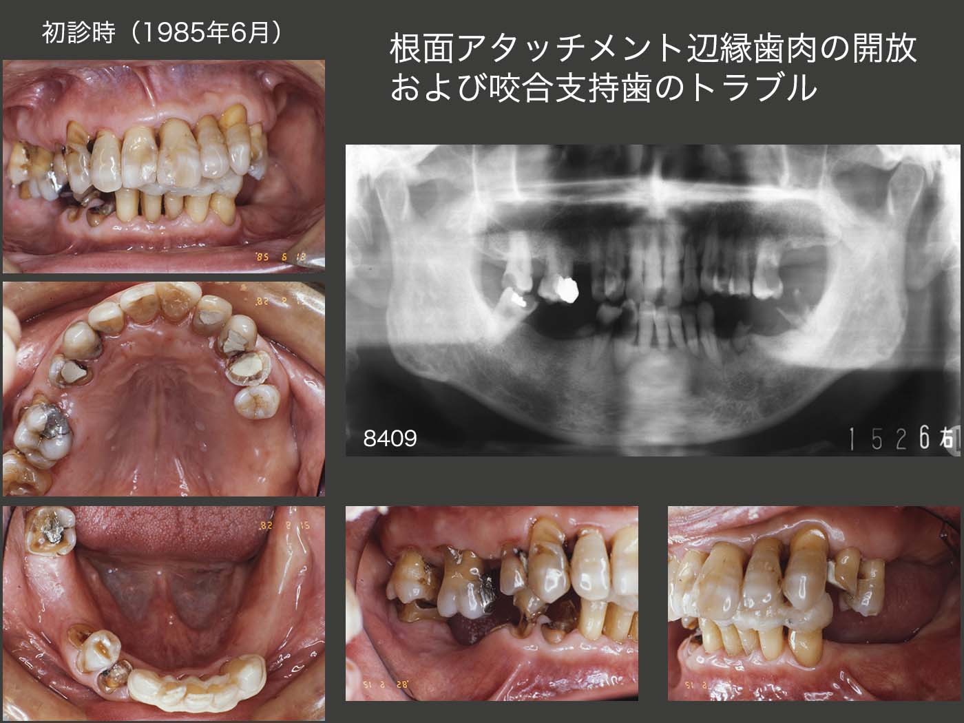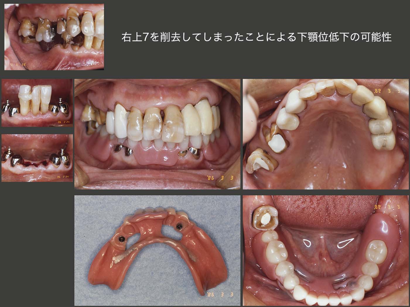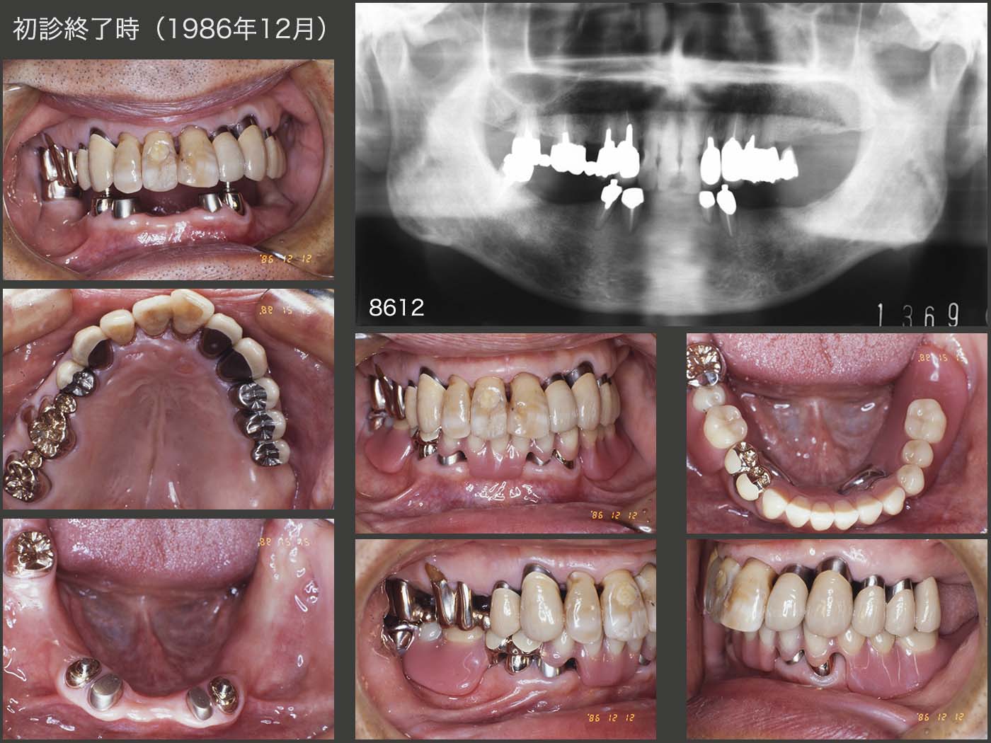 義歯装着の経験はなく,どうしても前歯で食事をとっているため,下顎前歯の歯周病が進行していた.本来なら総合的な一口腔単位の観点から,まず下顎に暫間義歯を装着し,下顎位を確保してから保存処置を行うべきであるが,この当時大学病院においてはこのような考え方あるいはシステムはなく,科別診療が行われていた.私自身もまだ卒後5年目,大学院を修了した年であり,全く臨床の基本が分かっていなかった.特に,咬合支持という概念は全くなく,また今であったら絶対にあり得ない右上3,6,7,右下7,左下2,3の抜随を再度保存科に依頼してしまったことは,痛恨のミスである.なお,この間も義歯は製作せず,あくまでも保存科での処置が終わってから,補綴するという考えに固着していた.