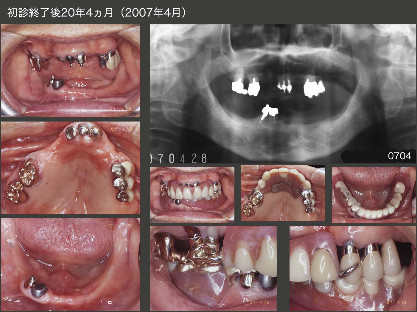 2007年4月,初診終了後20年4か月の状態である.スライド10〜12で考察するが,この間,合計7本の歯を失った.また,右上1,2および左上1に歯冠破折が生じた.96年,上顎に義歯を新製した.