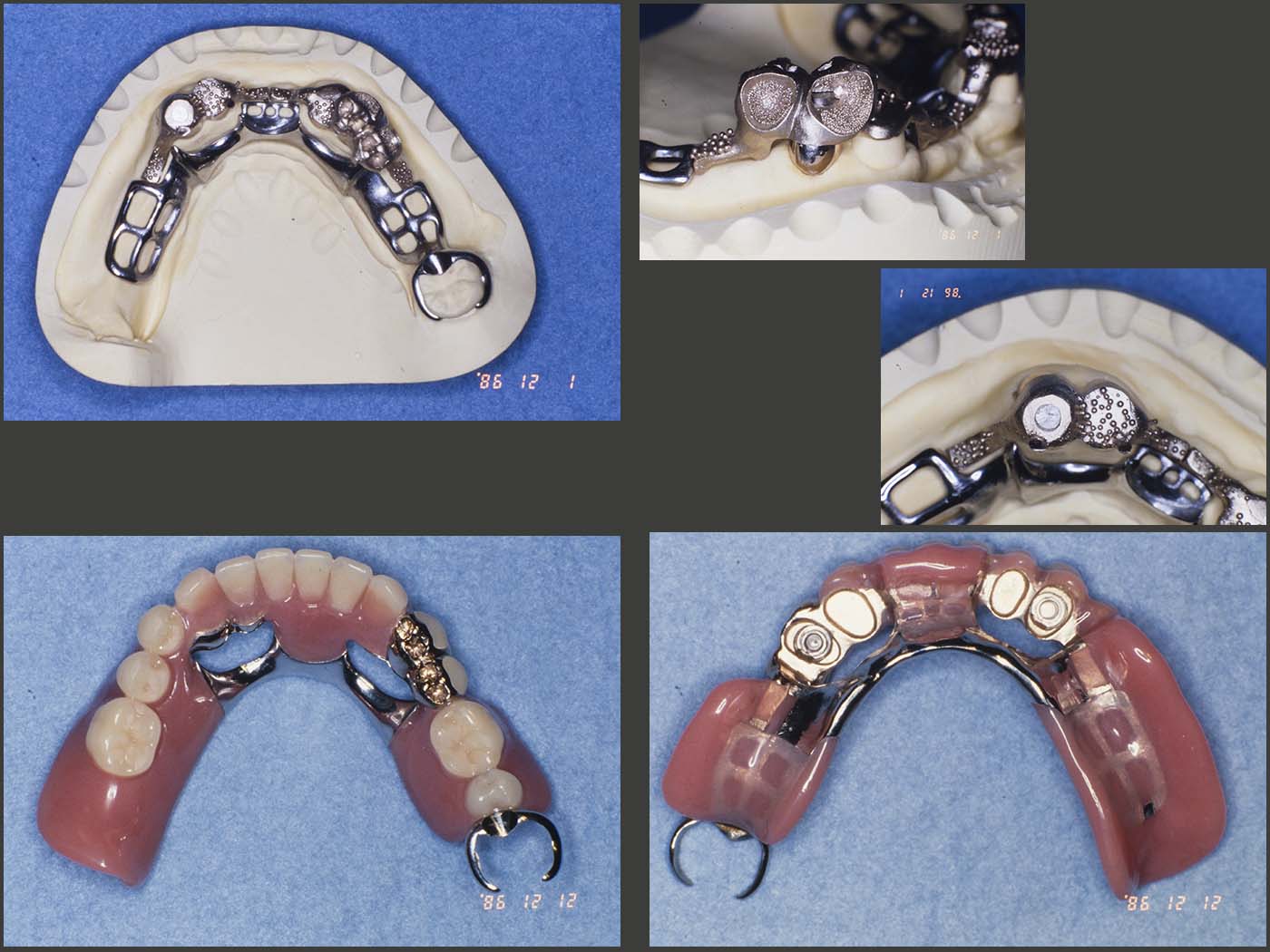 1986年12月,初診終了時の状態である.左上④⑤6には延長ブリッジを装着した.また,右上のクラウンは連結せずに単独で製作したことは,対合が義歯であることを考えれば,妥当な処置であった.右下4および左下3には,Baer stepped anchorアタッチメントを装着した.