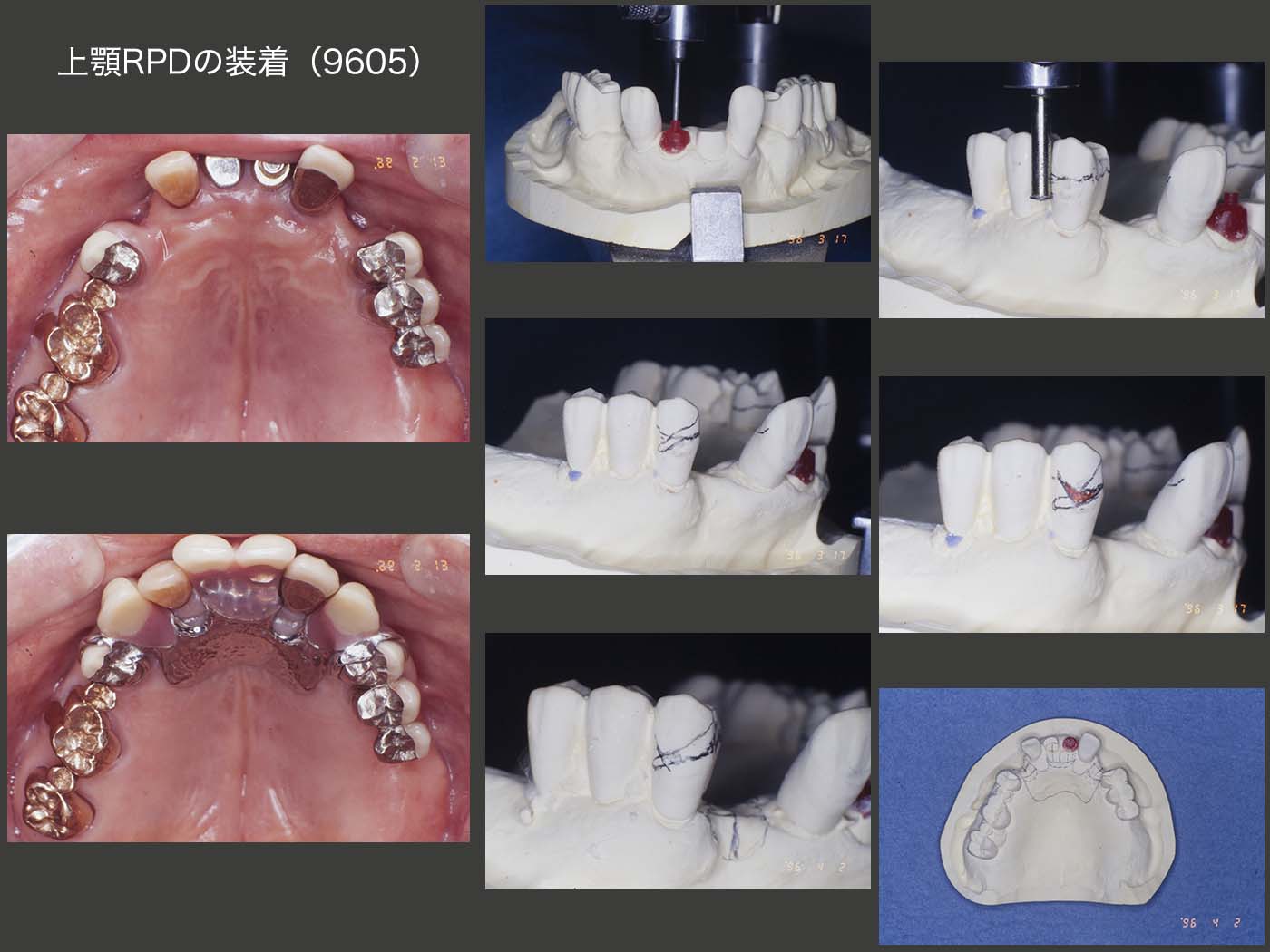 1996年5月に,上顎にパーシャルデンチャーを製作した.まず,概形印象を採得し,支台歯の前処置を行う.(本来は,アタッチメント製作時に同時に行うが)アタッチメントのメール部は咬合平面に垂直に製作されており,義歯の着脱方向となる.ここでは左上4を例に挙げるが,アンダーカット量1/4を得るとなると,サーベイラインとアームの位置関係が好ましくない.(スライド中央,上から2番目の形態になってしまう.)そこで,赤塗りの部分を口腔内で削去した.中央上から3番目の作業用模型においては,良い形態のアームになっている.このようにクラスプを用いる際は,必ず前処置を行い,所定のアンダーカット量,クラスプ体部の軸面,サーベイラインの確認をしたうえで,作業用模型の印象採得を行わなければならない.