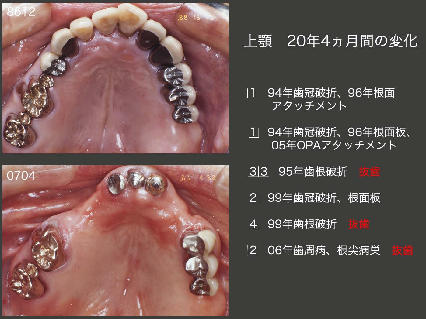 上顎において,この20年4ヵ月の変化は,スライドに記載してあるとおりである.すなわち,下顎に対合歯のある主に前歯部にトラブルが発生していることが分かる.最終的には,歯冠破折で残根状としたりあるいは歯根破折で抜歯となったが,その前に,何度かコンポジットレジン修復を施したり,再合着を繰り返してきた.