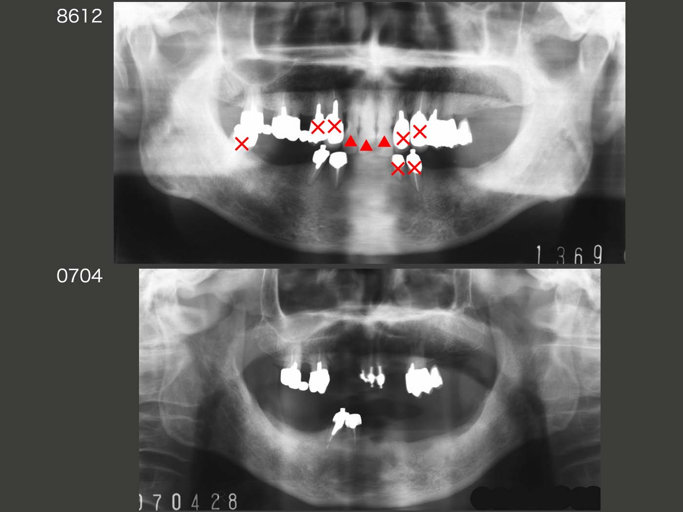 1986年初診終了時と,2007年初診終了後20年4ヵ月を比較したパノラマX線写真.赤印の×は抜去した歯であり,△印は歯冠破折した歯である.このスライドをみて明らかなのは,咬合支持歯に将来トラブルが生じるという事実であろう.一般的には上下の咬合支持歯同士でいわば勝負の形となってしまい,一方が抜け,もう一方が残るというようなことを多く経験している.しかし,残った方に全くダメージがない訳ではなく,今回の症例のように,最終的に双方が喪失してしまうこともある.一方,左上の延長ブリッジのように,力学的には不利であっても,そこであまり咀嚼せず,良く磨いていれば長持ちする.