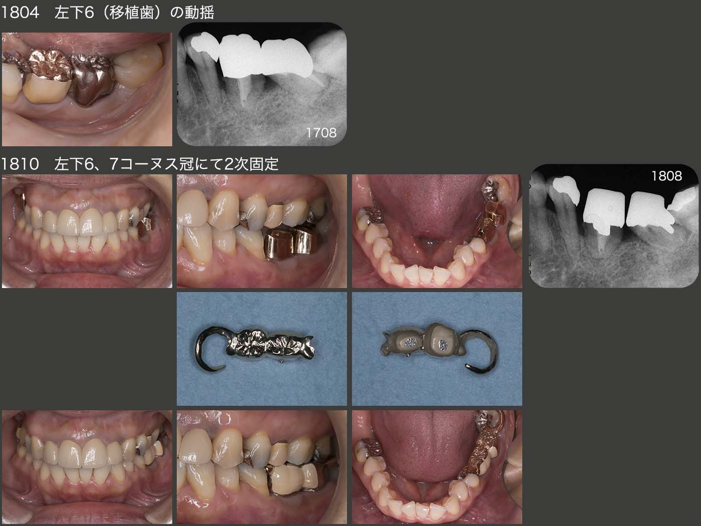 2018年4月,移植歯である左下6(元右上7)の動揺が大きくなった.歯周ポケットは遠心で5mm存在した.このままではさらに動揺が大きくなり,保存が危ぶまれると判断し,左下7と連結固定することにした.(結果的には,最初から連結固定したほうが良かったということなるが.)