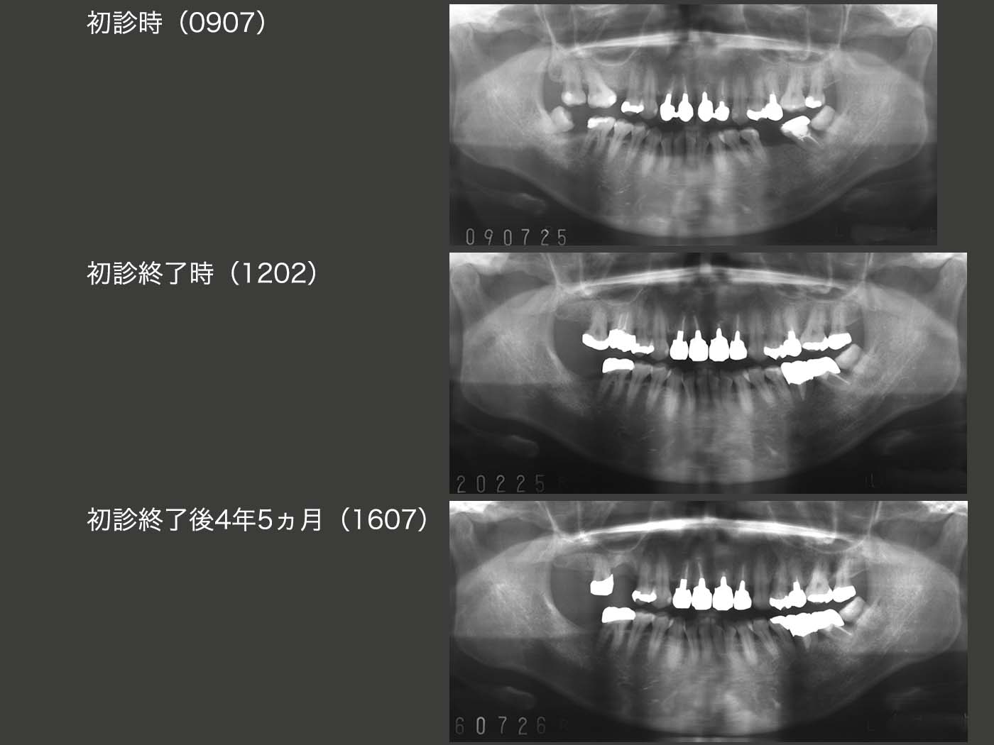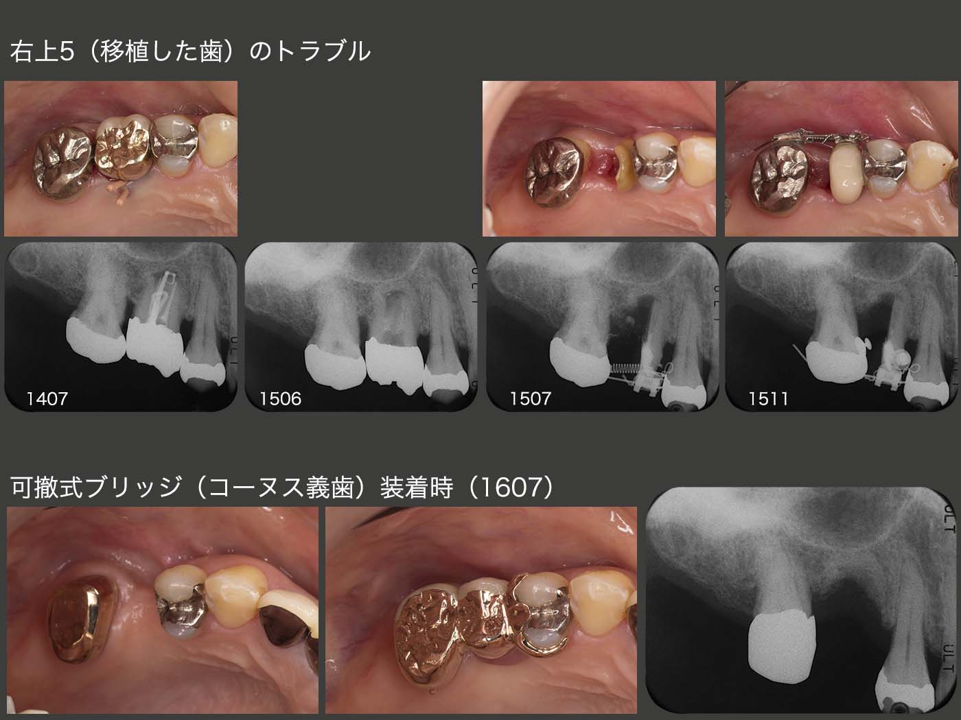 各ステージのパノラマX線写真の比較.苦労して移植した右上5(元右下8)を失ったのは大変残念である.抜歯窩でなく,顎堤への移植は難しいと改めて思い知らされた.結果的には,右下8の移植を行わず,最初から可撤式ブリッジを装着すれば良かったことになるが後の祭りである.