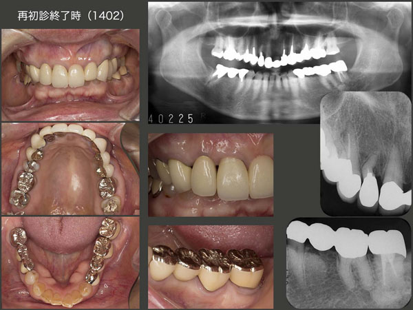 2014年2月,今回の一連の治療が一段落ついた時の状態.移植した右上2および左下7は,問題なく経過している.今後も咬合力が強いことから歯根破折が生じる可能性が懸念されるので,日中のTCH,咀嚼時に少しだけ力を抜くことを常に意識するようにお願いしている.
