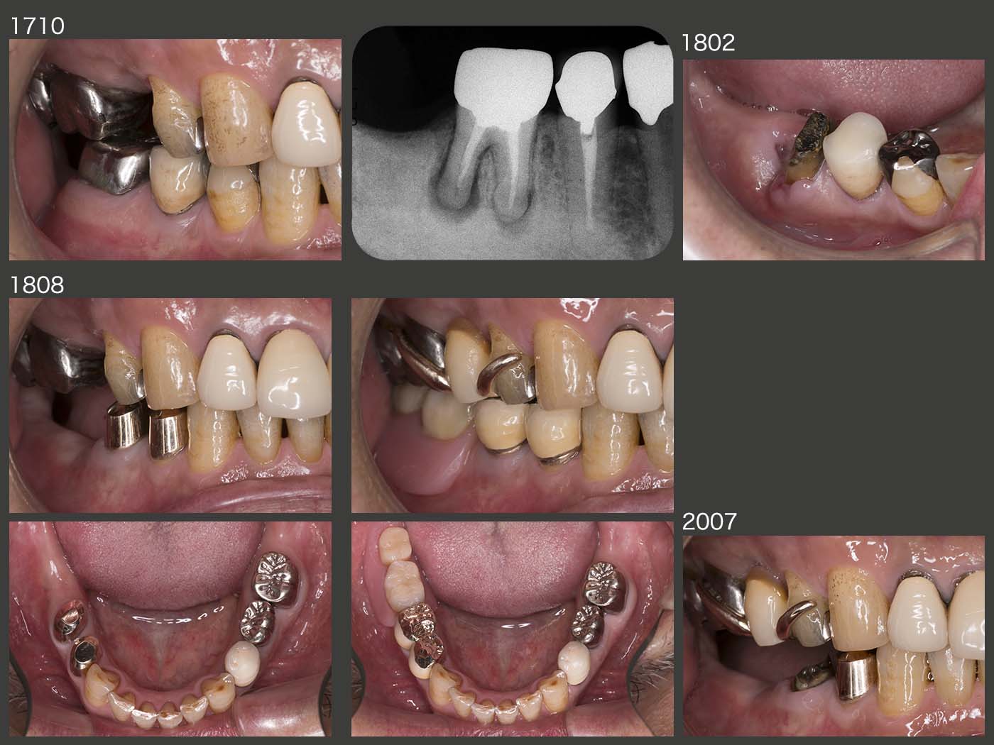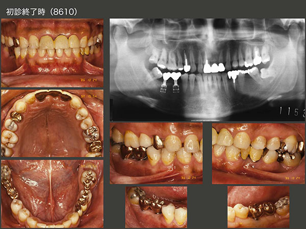 2003年12月初診の58歳女性.本格的な治療開始は,左下4の歯根破折による痛みが生じた06年3月から.まず,左下4を抜去し,当初はスライド下段に示すようなパーシャルデンチャーを8月に装着した.しかし,咬合面の金属色,左下3のクラスプの審美障害等から受け入れられず,結局インプラントを2本植立した.(06年9月オペ,07年5月補綴装置装着,スライド右下は07年11月,インプラント上部構造の咬合面は金属にして頂いた.)