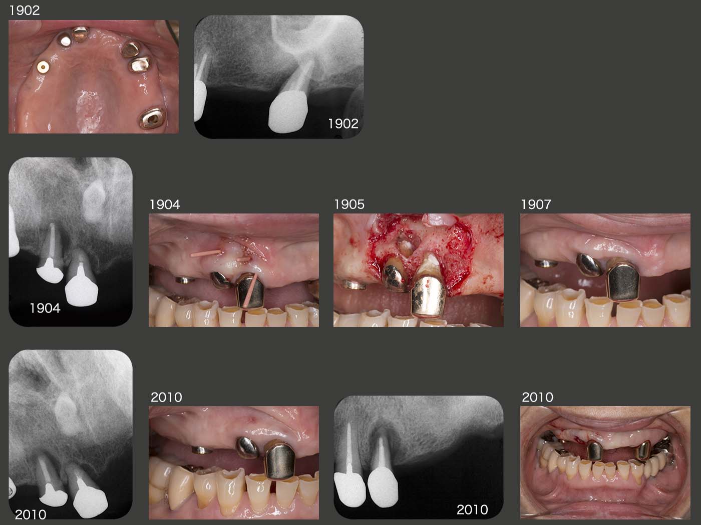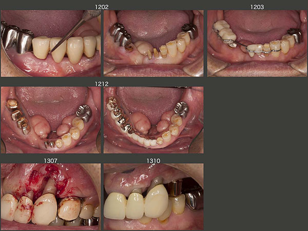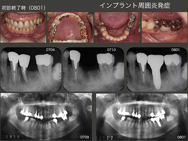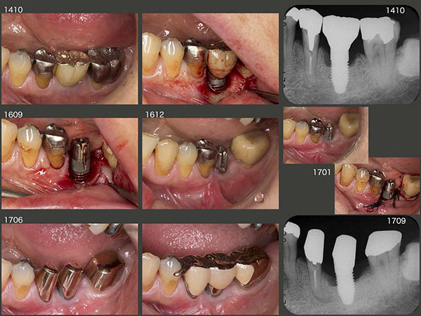 1994年11月初診,当時47歳の女性.2007年5月に左下6の近心根を歯根破折にて抜去した.そして,11月に直径5mm,長さ10mmのインプラントを植立した.スライド上段右端に08年1月,硬質レジン前装冠装着時を示す.今になって思うと,顎堤の近遠心的な距離があるので直径5mmを選択したが,頰舌側の距離がないことから,骨の水平的拡大が必要,あるいはこのサイズのインプラントの適応症ではなかったと反省している.そのためか,数年後にインプラント周囲炎が発症してしまった.