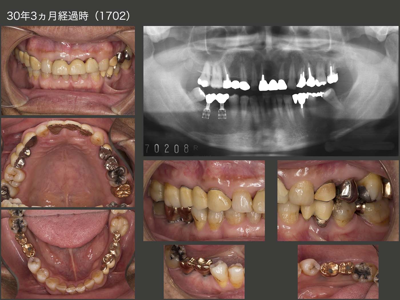 1997年まで,大学病院で定期健診を行っていた.その後暫く拝見することができなかったが,2008年以降,私の診療室まで何時間もかけて通院してくださるようになった.右下のインプラントは30年経過しても順調だが,この理由は2つあると考えている.まず,先にも述べたが咬合面の面積を小さく製作したことが挙げられる.つぎに,インプラントでは嚙んだ時の食感が少ないことから,上下顎に歯のある左側で主に咀嚼していたからと考えている.しかし患者さんは,右側でも咬んでいるとおっしゃっているし,左側の歯に特に問題が生じていないことから,確かに両側で咬んでいるのかもしれない.