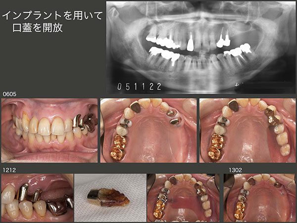 患者さんは,相変わらず左側が咬みやすいとのことで,私としては左上3が歯根破折を起こすことだけは何とか避けたかった.左上3が有髄歯ならそれ程心配する必要ないが,2回続けて左側にトラブルが生じたこと,左上3が失活歯であることを考慮し,左上4部に7mmの長さのインプラントを1本埋入した.なお,インプラントの上部構造に磁性アタッチメントを使用したので維持は十分であることから,審美性を配慮し左上3の唇側ワイヤークラスプを除去した.また,インプラントの周囲を開放し,清掃性の向上に努めた.さらに,右上5および7に架かっていたクラスプを1本にして,口蓋を覆う大連結装置の面積を少なくした.