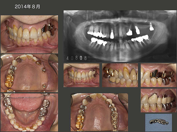2014年8月,今回の治療が一区切りついた時の状態.この症例で片側処理の補綴を行う場合は,インプラントの助けが必要となる.植立位置は,上顎洞の前後とし,7mmおよび8.5mmの長さのインプラントを用いた.固定式のブリッジでも補綴処置は可能であるが,過去に可撤式の義歯を使用していた経験があること,また支台の清掃性を重視したいことから,コーヌス義歯を選択した.