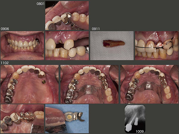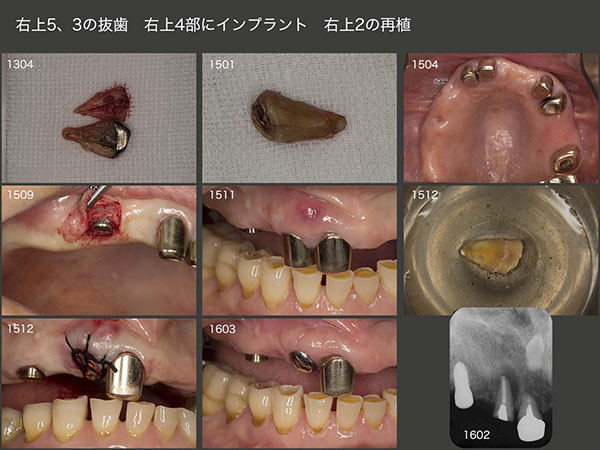 その後の経過は,右側が咀嚼側になったためか,まず右上5が2013年4月に歯根破折した.続いて15年1月,右上3に歯根破折が生じた.右上3という防波堤を失ったため,直ぐに右上1,2もドミノ倒し的に歯根破折が生じると考えた.それを阻止する目的で15年9月,右上4部にインプラントを1本植立した.インプラントと骨が結合する待機中に,今度は右上2にフィステルが生じた.また歯根破折と考えたが,歯周ポケットが最大5mmであったことから,根尖病巣の再発あるいは歯根破折の両方が疑われた.根尖は大きく拡大していたため,通常の感染根管治療は無理と判断した.15年12月,この歯を抜歯してよく観察したところ,幸い破折線が認められなかったので,根尖病巣と診断し,通法にしたがって再植した.補綴装置は,歯になるべく側方力をかけたくなかったので根面板とした.