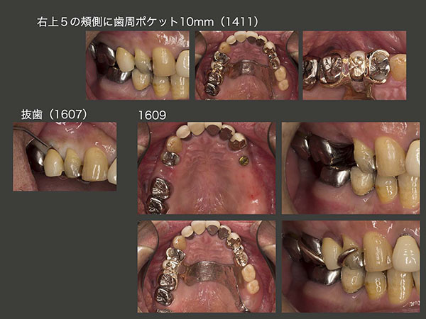 この患者さんは右咬みなのか,2015年7月に5mmであった右上5の歯周ポケットが16年2月には9mmと,歯周病が急に悪化した.そこで仕方なく右上5の抜髄を行い,自然挺出を行った.8月まで3ヵ月間挺出したのち,同月歯周外科処置を行った.歯周ポケットは3mm以下に改善したが,歯の動揺が残ったため,右上4と連結固定した.