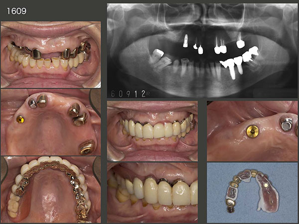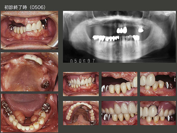 2005年11月初診,53歳女性.左上コーヌス義歯は,7年前に他院にて製作.一般的には上下顎に歯が沢山残っている右側で咀嚼すると思われるが,本人は元々左側咬みで,義歯を入れてからも左側の方が咬みやすいとおっしゃっていた,珍しいケース.初診時は,左下5のう蝕処置のみを行い,06年5月から右下5〜7の治療を行った.スライド中段は,06年5月の上顎の状態.