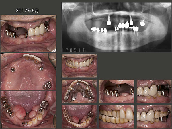 2019年2月に左上7を歯周病にて抜去した.4月,15年に再植した右上2および右上1にフィステルが出現したので,右上2については歯根端切除術,右上1については穿孔らしき部位をスーパーボンドにて閉鎖した.7月の時点では,フィステルは消失した.しかし,20年10月,右上2に再びフィステルが生じたため,今回はさすがに諦め抜去した.また左上4に歯根破折が生じ,抜去した.まだ支台歯が2本(右上1は危険な状態)とインプラントが1本あるので,義歯の安定は問題ない.しかし,総義歯に誘導するか,左側にもう1本インプラントを追加するかの判断をする時期は近い.(私は,総義歯で十分と思われるが,最終的には口蓋義歯床の違和感を患者さんがどの程度訴えてくるかによる.)