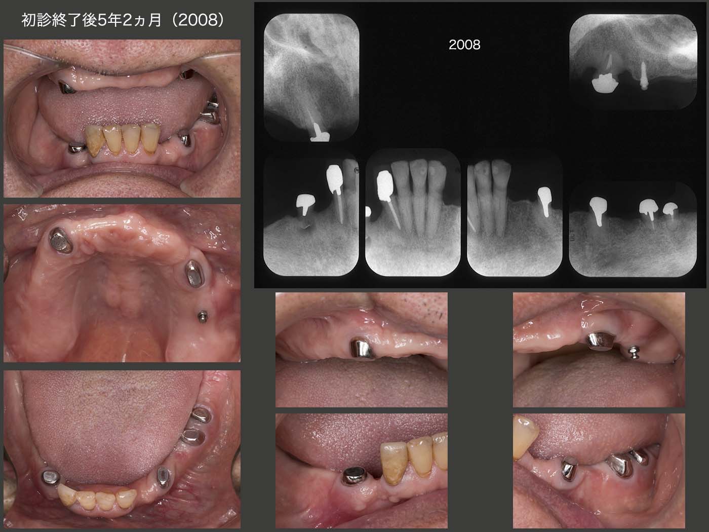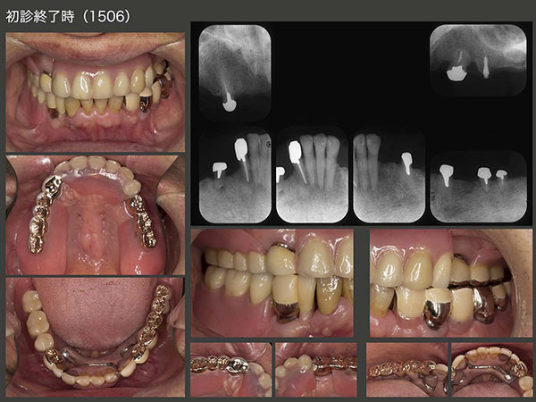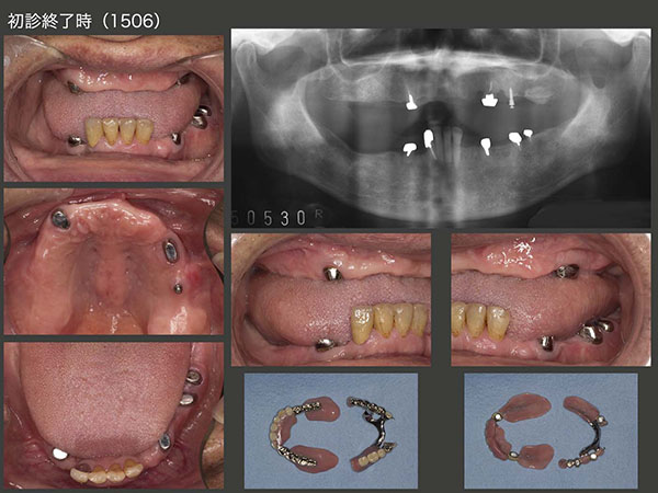 2015年6月,初診終了時の状態.初診より3年2ヵ月が経過してしまった.患者さんには長い間通院してくださり,心より感謝する次第である.上下顎とも支台歯が左右側にあることから,義歯の安定はすこぶるよい.左上のミニインプラントは役目が終わったので本来なら除去すべきところであるが,特に問題もないことからこのまま置いておくことにした.