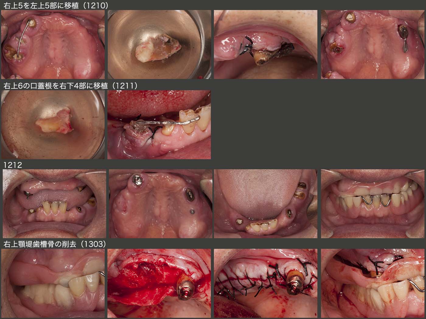 暫間義歯で下顎位の確保を行い,次の段階の治療に進んだ.まず,残根状態の右上5を矯正的挺出することで抜きやすくしたうえで抜去し,左上5部に移植した.なお遠心にミニインプラントを植立し,移植歯の固定を図った.つぎに,右上6の口蓋根を抜去し,右下4部に移植した.なお,頰側根は廃棄した.移植が成功すれば,上下顎とも切歯を除いた左右両側に支台歯が存在することになり,義歯の安定性が向上する.