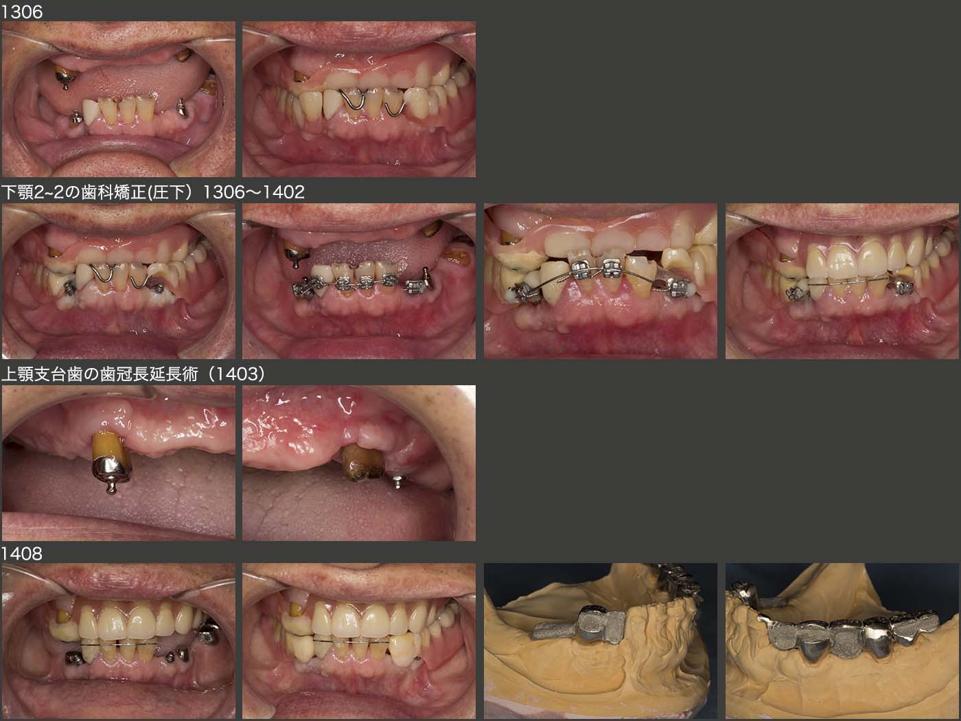 つぎに下顎の2〜2の挺出を元に戻すために,まず下顎左右2の遠心にミニインプラントを植立し,歯科矯正の際の固定源とした.約8ヵ月かけて2〜2を圧下させた.さらに,上顎義歯の咬合平面を整えるために,右上3および左上5(移植歯)の歯冠長延長術を施した.14年8月,基礎となる治療はすべて終了し,これより補綴処置に移行した.