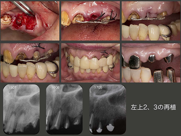 上顎犬歯が左右側にあるか否かが義歯の安定に大きな影響を及ぼすことは自明の理である.左上3は歯根破折しているが,根尖に近い側の歯根膜は健在であることから,再植を行い,うまく生着すれば少なくとも同部の顎堤保存および食感の認知に役立つと思い,実行した.左上2も同時に再植しようと試みたが,なかなか愛護的に抜去できず,このまま突き進めれば歯根破折が生じると思い,一旦中止した.左上3が落ち着いたところで,挺出力をかけ,歯の動揺が生じてから改めて再植した.最終補綴装置は,左上2は根面板,左上3は磁性アタッチメントをそれぞれ装着した.