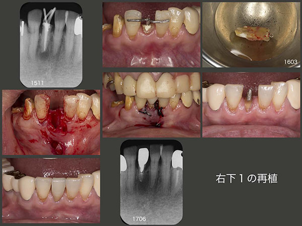 ここで右下1について述べる.まず通常の感染根管処置を施したが,治癒せず,フィステルが再出現した.歯根端切除術を行うか迷ったが,今回はここも挺出力をかけ,歯の動揺が生じたうえで再植した.根尖付近に人工的穿孔が認められ,スーパーボンドにて封鎖した.1年3ヵ月経過をみたうえで,メタルボンド冠を装着した.患者さんには,ここでは硬食品を咬まないでくださいとお願いしている.
