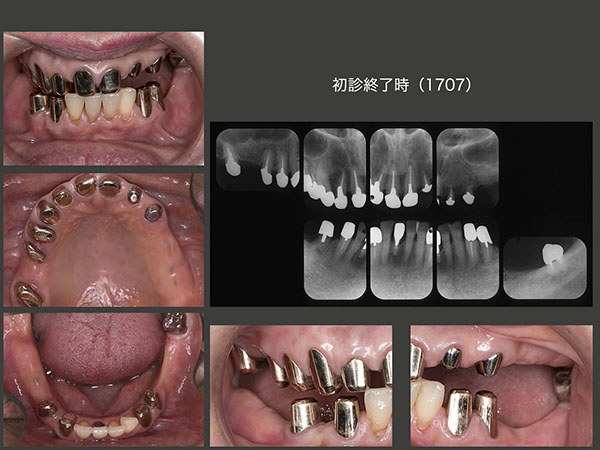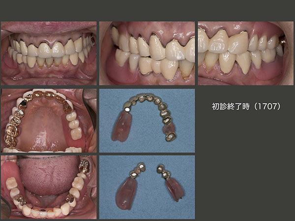 上顎左側前歯が何時外れてもよいように,早急に上顎に暫間義歯を装着した.(2015年6月) 上顎は初めての義歯であるため,口蓋部義歯床の違和感,発音がしにくい等色々な不満がでることをあらかじめよく説明しておいた.取り敢えず上顎が落ち着いたところで,右下8を抜歯し,左下のブリッジを切断,除去したのち,下顎にも暫間義歯を装着した.(15年8月) なお,義歯装着直後にクラスプを架けた右下4の冠が外れてしまった.